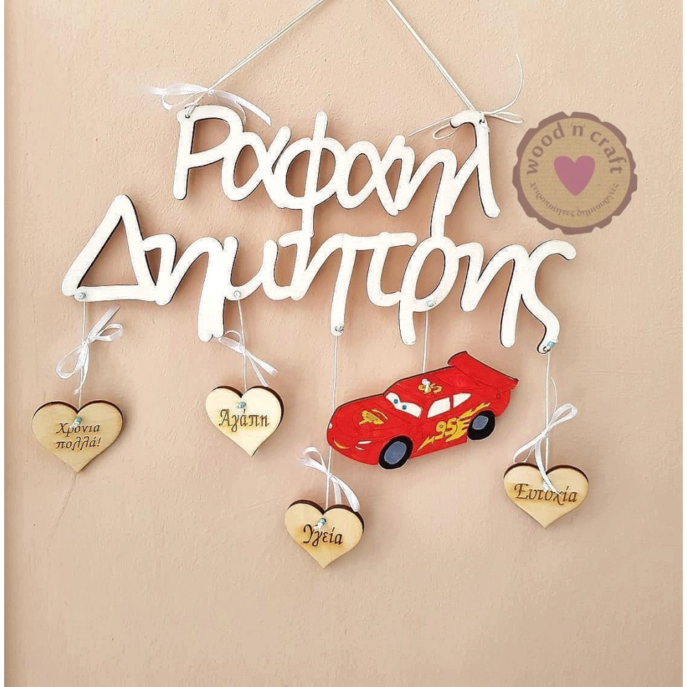 Ξύλινο χειροποίητο παιδικό αναμνηστικό όνομα της επιλογής σας με τον Κεραυνό Μακουίν και κρεμαστές ευχές ή τα στοιχεία γέννησης του παιδιού! Το πιο ξεχωριστό αναμνηστικό δωράκι βαμμένο στο χέρι, ιδανικό για την διακόσμηση του παιδικού δωματίου!