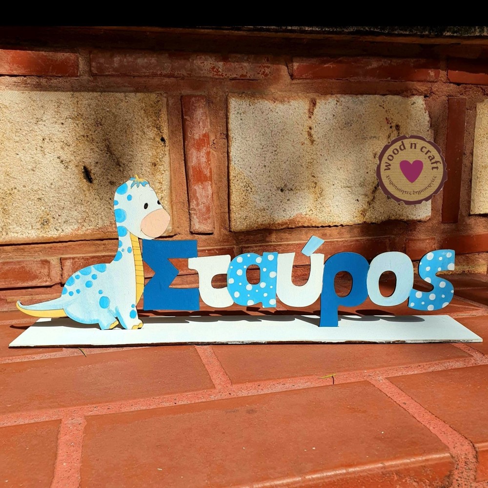 Ξύλινο χειροποίητο σταντ όνομα της επιλογής σας διακοσμημένο με ένα γλυκό δεινοσαυράκι! Βαμμένο σε χρώμα της επιλογής σας με δυνατότητα επιλογής ονόματος και επιλογής μεγέθους. Ένα μοναδικό διακοσμητικό ιδανικό για στολισμό βάπτισης με θέμα τον δεινόσαυρο.