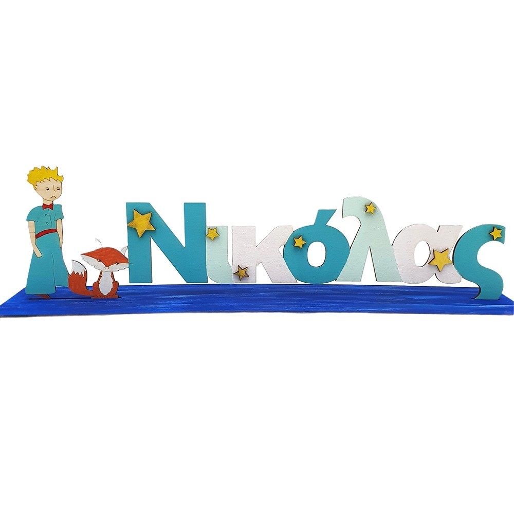 Ξύλινο χειροποίητο σταντ όνομα της επιλογής σας διακοσμημένο με τον αγαπημένο Μικρό Πρίγκιπα, την αλεπού του και πολλά μικρά κίτρινα αστεράκια.. Μία επιλογή κατάλληλη για να διακοσμήσει την βάφτιση ή το παιδικό δωμάτιο! Βαμμένο σε χρώμα της επιλογής σας.