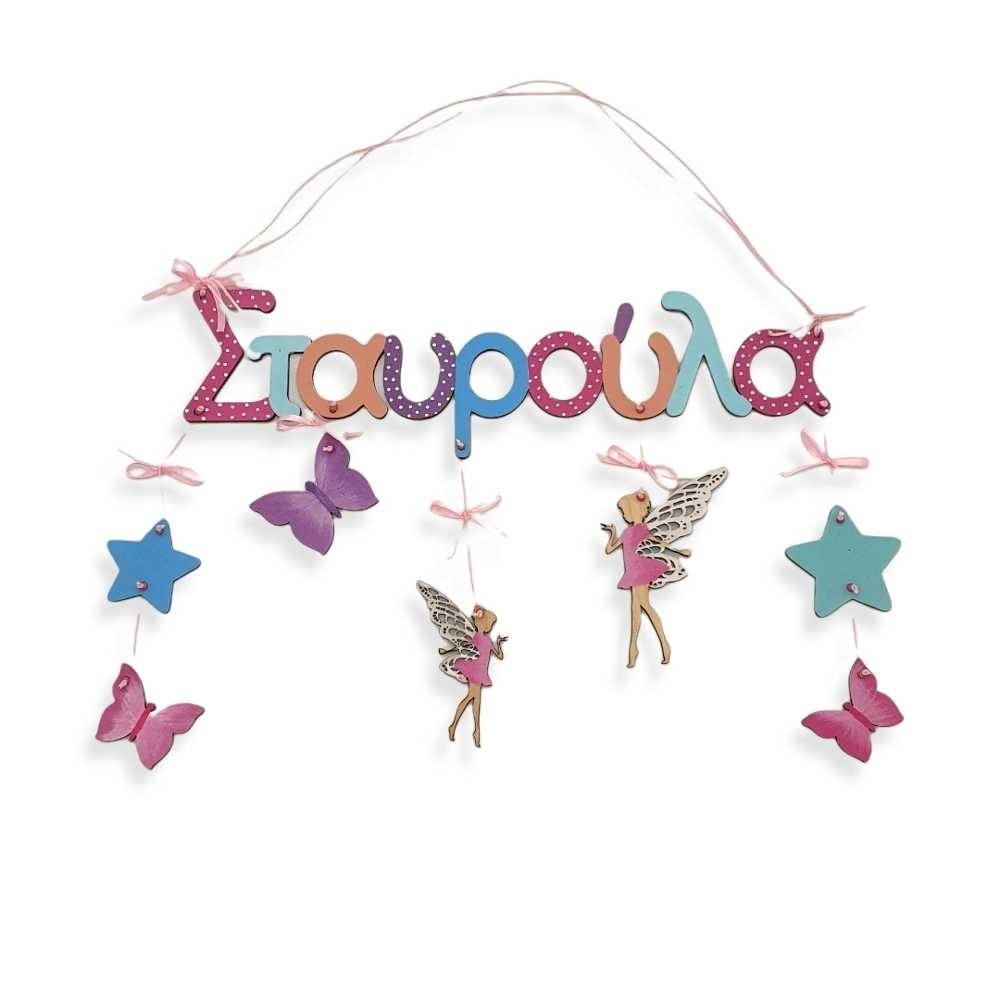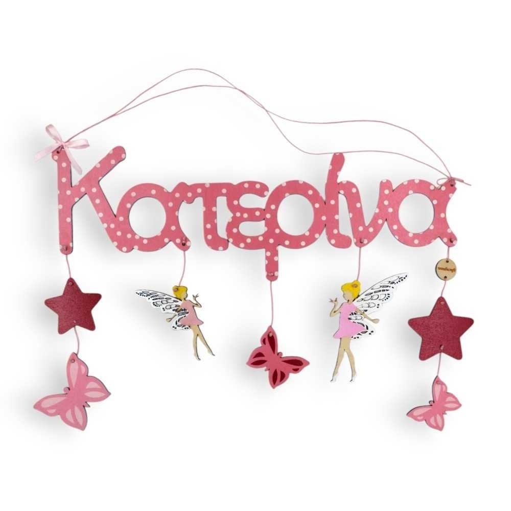 Μοναδικό ξύλινο χειροποίητο διακοσμητικό όνομα στολισμένο με κρεμαστά αστεράκια, πεταλούδες και παραμυθένιες νεράιδες!