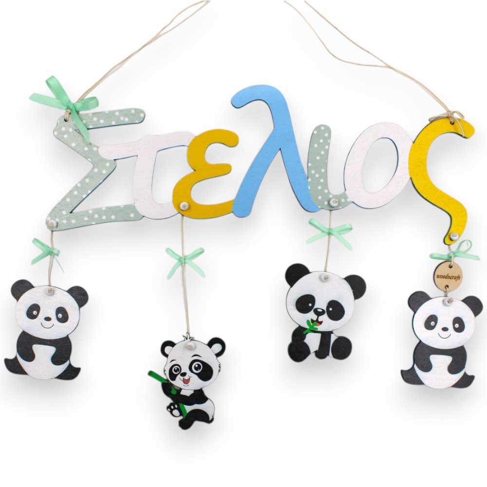 Το ξύλινο όνομα - Panda bears είναι ένα υπέροχο διακοσμητικό που μπορεί να προσθέσει μια ξεχωριστή πινελιά στο παιδικό σας δωμάτιο. Το όνομα είναι φτιαγμένο από ξύλο και είναι βαμμένο στο χέρι σε χρώματα της επιλογής σας. Τα μικρά αρκουδάκια πάντα κρεμασμένα από το όνομα με κερωμένο κορδονάκι, κορδελάκια και χάντρες προσθέτουν ακόμα περισσότερο χρώμα και παιχνιδιάρικο στυλ και δημιουργούν μια γλυκιά και χαριτωμένη ατμόσφαιρα στον χώρο.