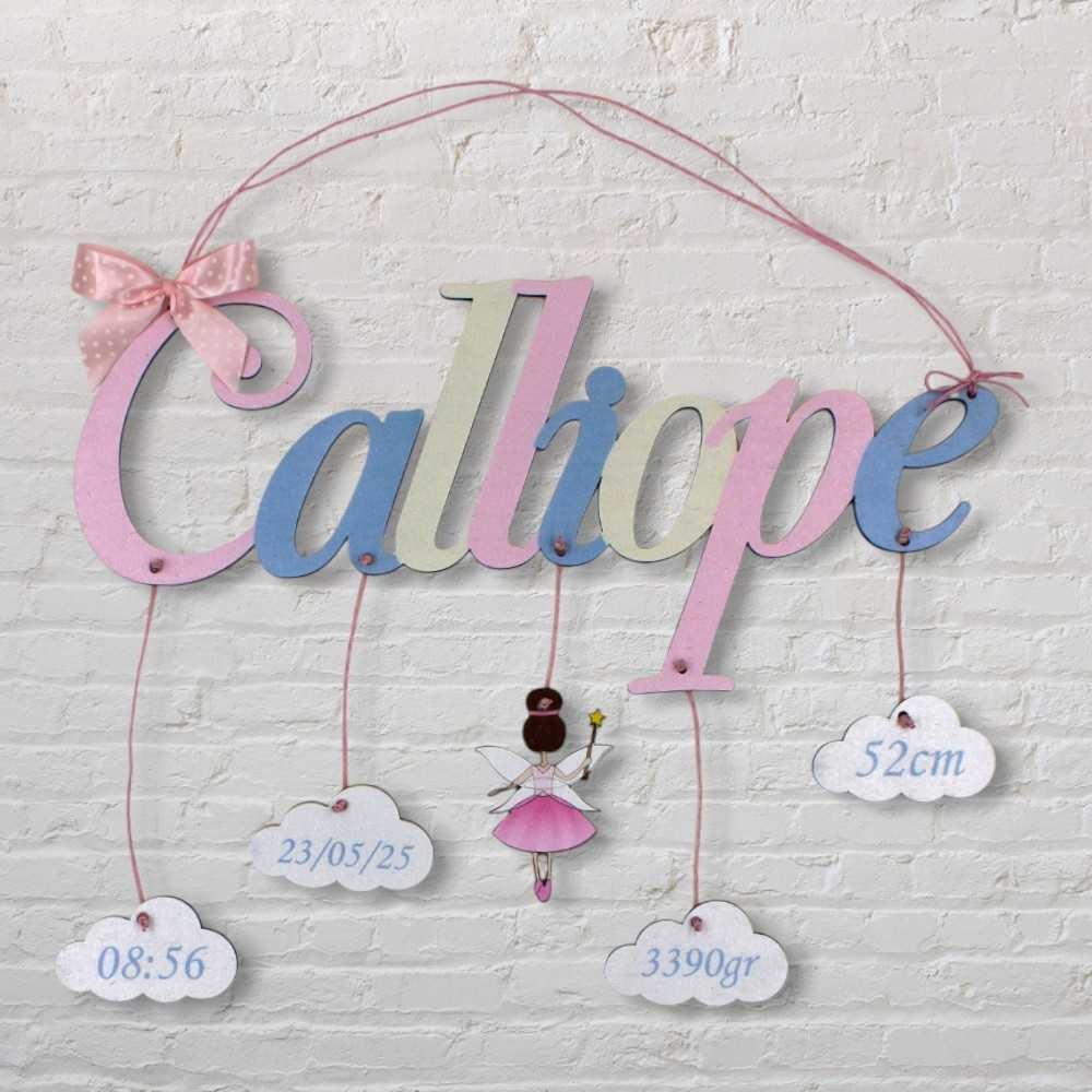 Ξύλινο χειροποίητο παιδικό αναμνηστικό όνομα της επιλογής σας με μία γλυκιά νεράιδα και κρεμαστά συννεφάκια χαραγμένα με ευχές ή με τα στοιχεία γέννησης του παιδιού. Φτιαγμένο με κερωμένο κορδόνι και κορδελάκια επιλεγμένα για να ταιριάζουν με το χρώμα του ονόματος.