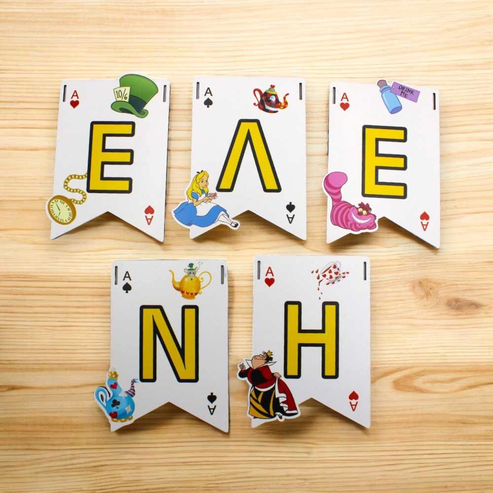 Κάθε γράμμα είναι εκτυπωμένο με UV σε ξύλο και στολισμένο με χαρακτηριστικά στοιχεία από τον μαγικό κόσμο της Αλίκης – από τον Τρελοκαπελά, τη γάτα του Τσέσαϊρ, την Βασίλισσα των Καρδιών και άλλα εμβληματικά σύμβολα!