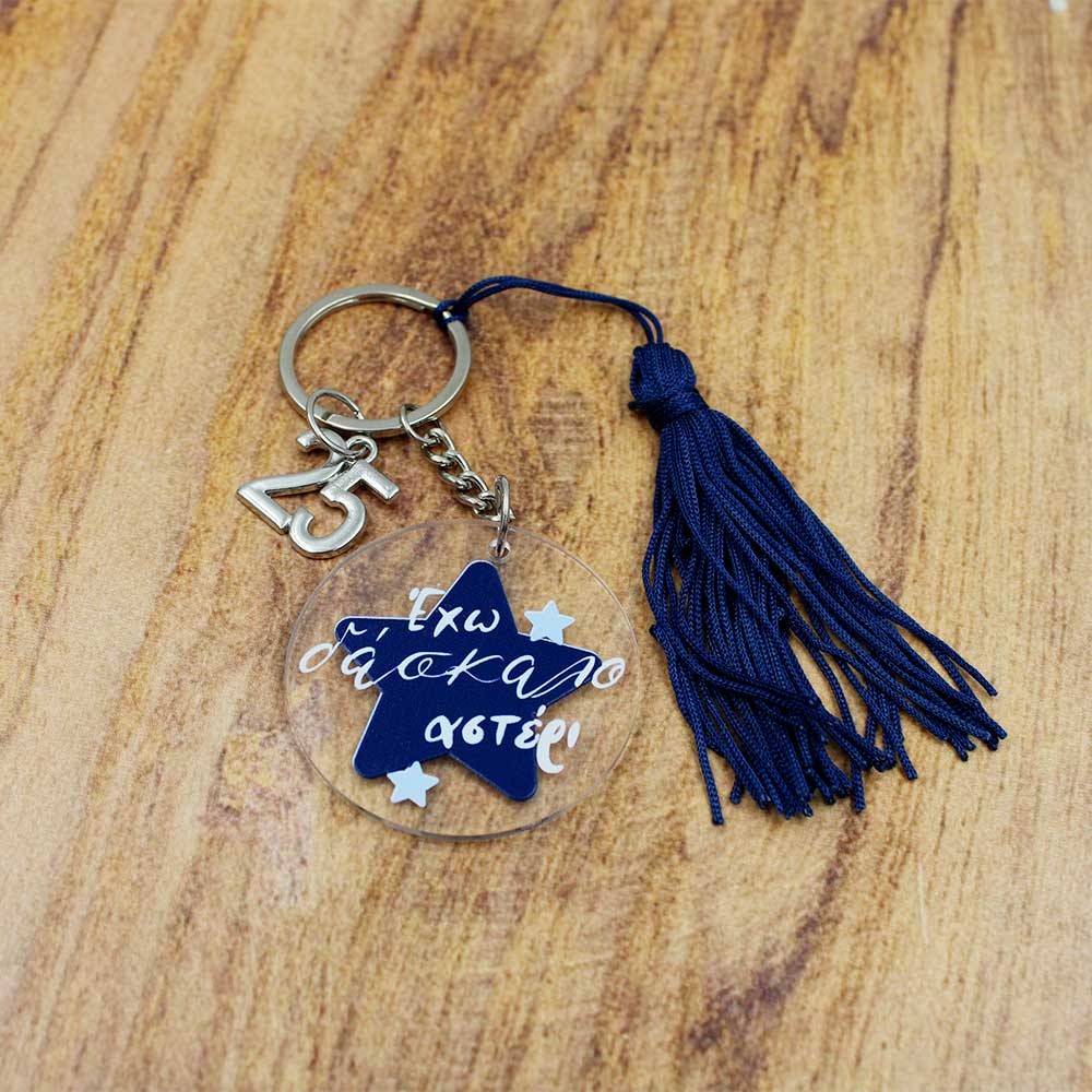 Κατασκευασμένο από διάφανο plexiglass, με UV εκτύπωση σε σχήμα μπλε αστεριού και μήνυμα "Έχω δάσκαλο αστέρι".