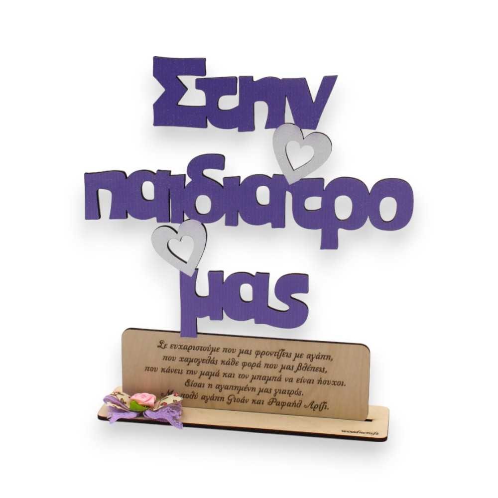 Αυτό το χειροποίητο ξύλινο σταντ από την Woodncraft, φέρει την φράση "Στην παιδίατρό μας", κομμένη με ακρίβεια για να σχηματιστεί όμορφα αυτή η αφιέρωση. Η φράση είναι προσαρμοσμένη με διάτρητες καρδούλες και ένα ειδικό πλαίσιο στο οποίο χαράζεται το προσωπικό σας μήνυμα, στιχάκι ή αφιέρωση.