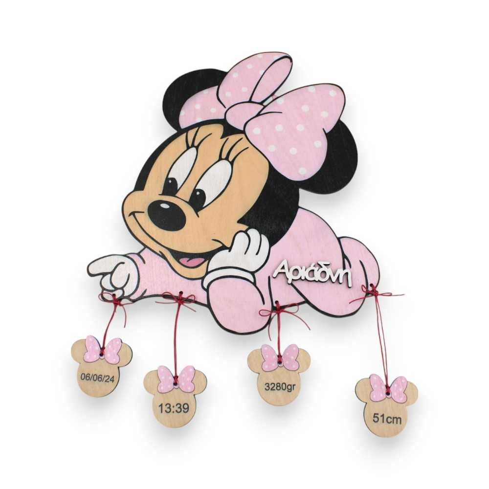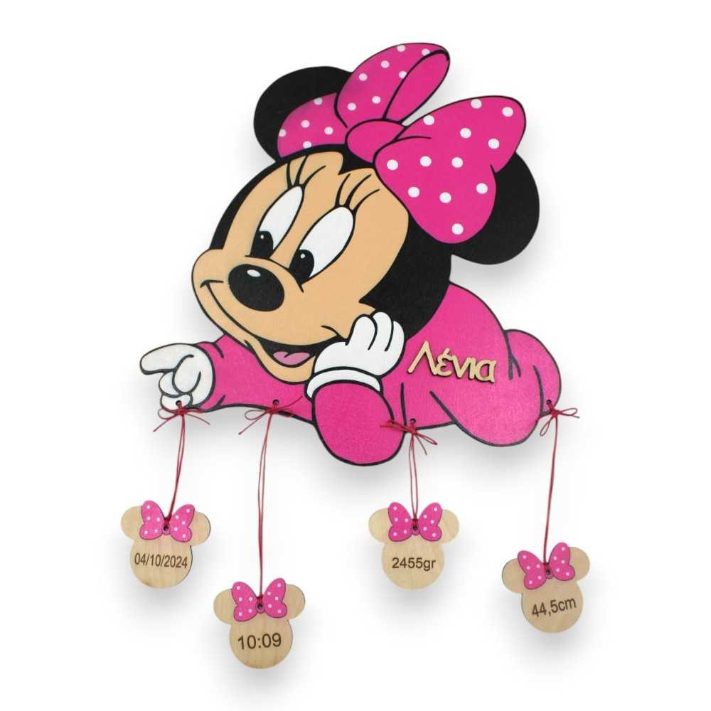 Διαμορφωμένο ως η αγαπημένη Minnie Mouse, αυτό το γλυκό αναμνηστικό συνοδεύεται από κρεμαστές ευχές ή τα στοιχεία γέννησης του παιδιού, προσφέροντας μια ευχάριστη και προσωποποιημένη υπενθύμιση της μαγικής αυτής ημέρας.