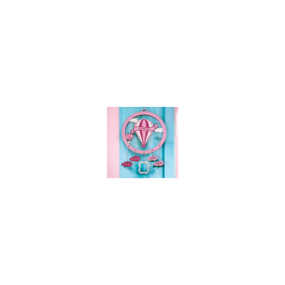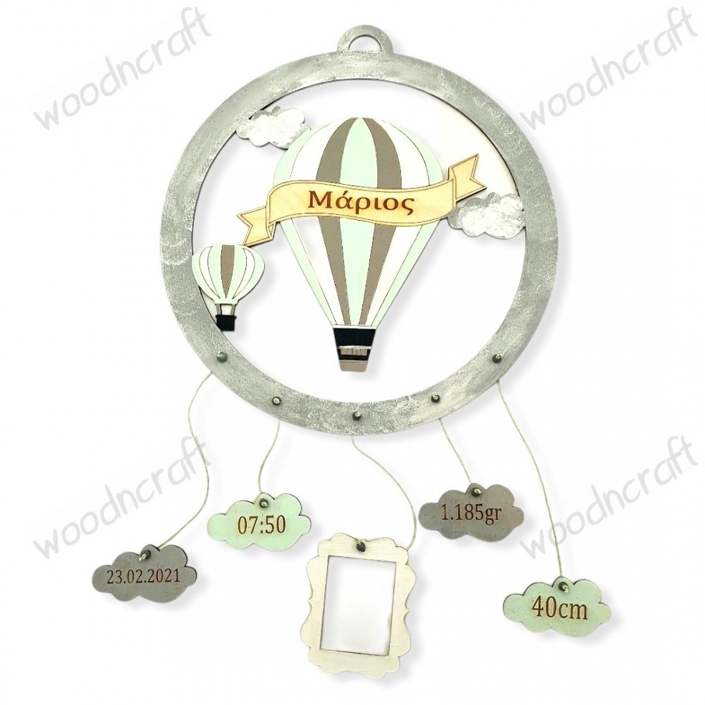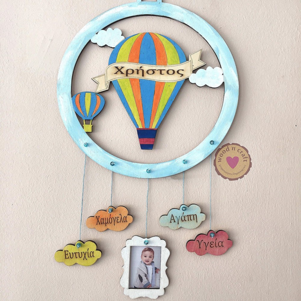 Ξύλινο χειροποίητο παιδικό ενθύμιο γέννησης σε σχέδιο στεφανάκι με αερόστατο με χαραγμένο το όνομα της επιλογής σας! Διακοσμημένο με κρεμαστά χρωματισμένα συννεφάκια με ευχές και κορνιζάκι για φωτογραφία!