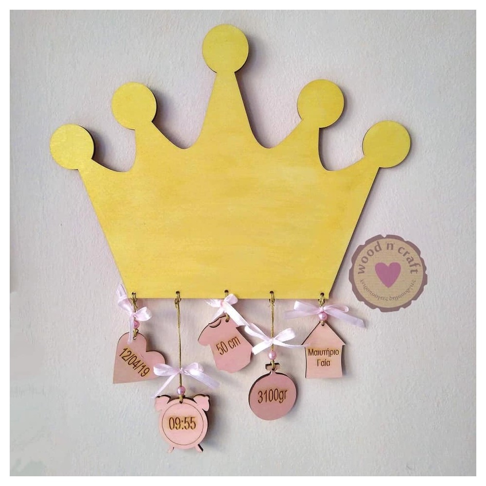 Ξύλινο χειροποίητο κρεμαστό αναμνηστικό γέννησης σε σχέδιο κορώνα με κρεμαστά στοιχεία γέννησης. Βάφεται σε χρώματα της επιλογής σας!