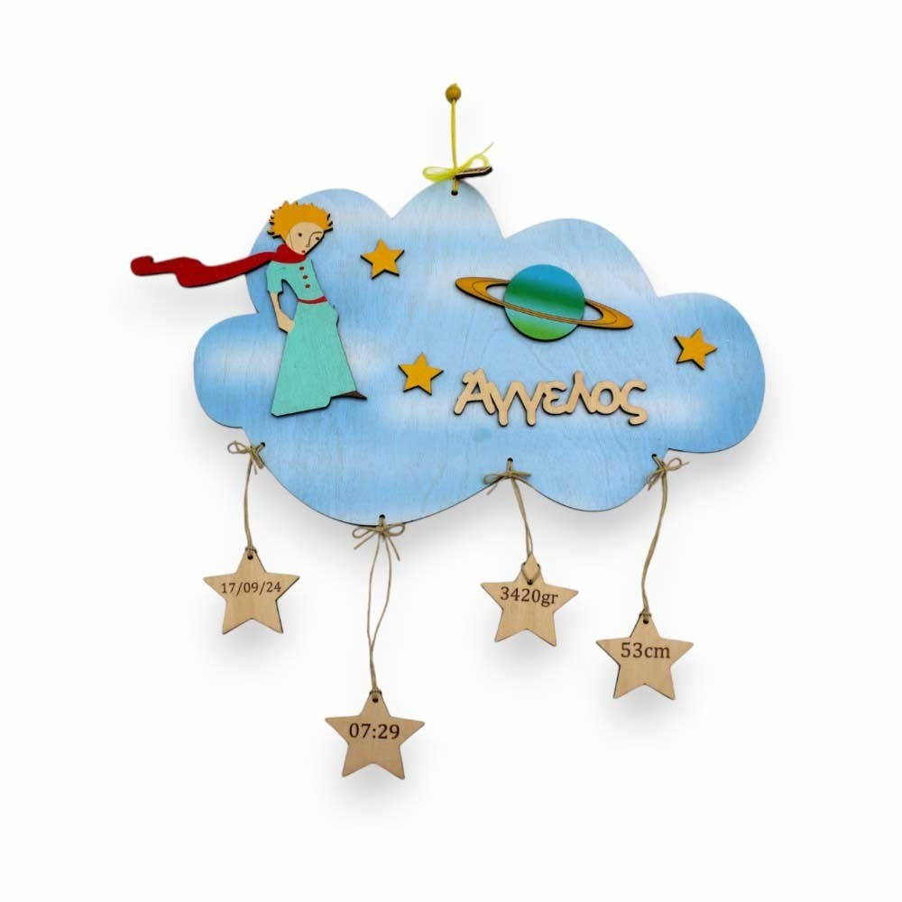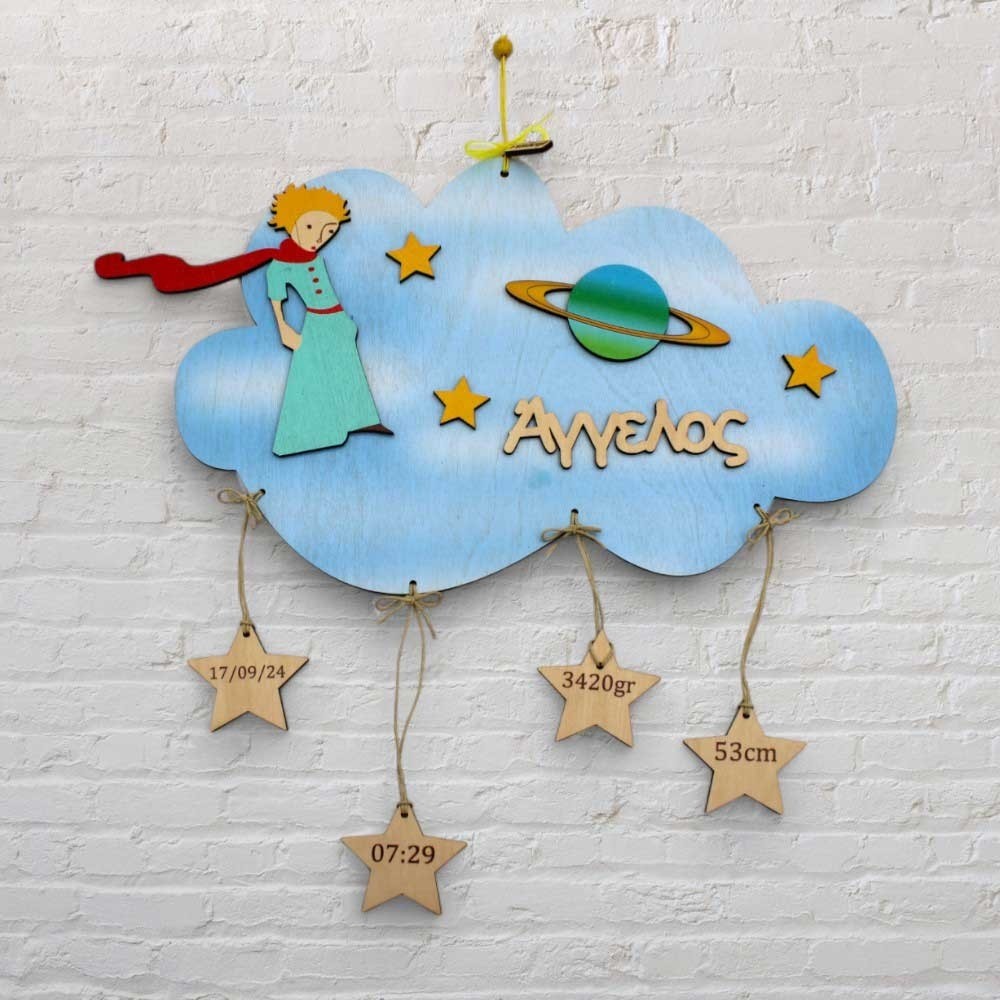 Ξύλινο χειροποίητο παιδικό αναμνηστικό γέννησης σε σχέδιο σύννεφο διακοσμημένο με τον αγαπημένο μας Μικρό Πρίγκιπα, το όνομα της επιλογής σας και χαραγμένες ευχές σε μικρά κολλημένα αστεράκια! Βαμμένο στα χρώματα της επιλογής σας.