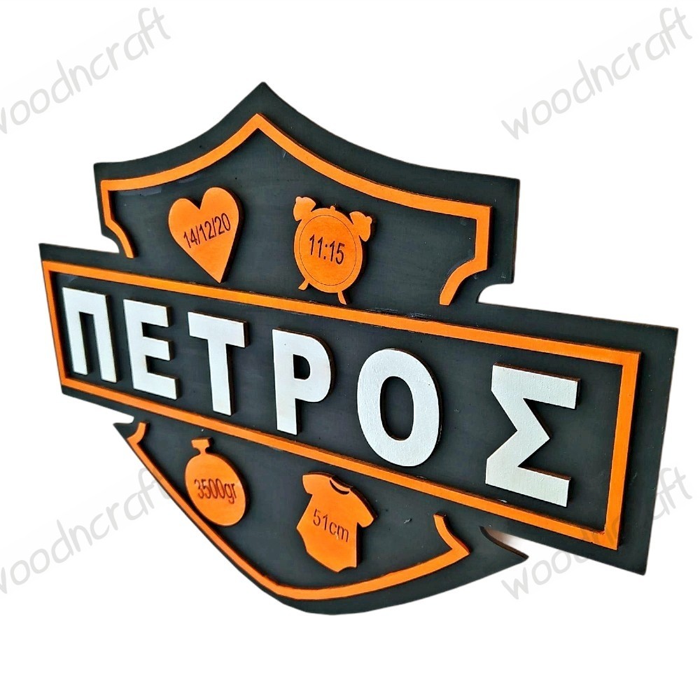 Μοναδικό ξύλινο παιδικό αναμνηστικό σε θέμα Harley Davidson. Ένα πρωτότυπο χειροποίητο 3D διακοσμητικό σε ξύλινη επιφάνεια κομμένη στο σχήμα του λογότυπου της Harley με πρόσθετα γράμματα που σχηματίζουν το όνομα της επιλογής σας και ξύλινα στοιχεία που έχουν χαραγμένα τα στοιχεία γέννησης του παιδιού!