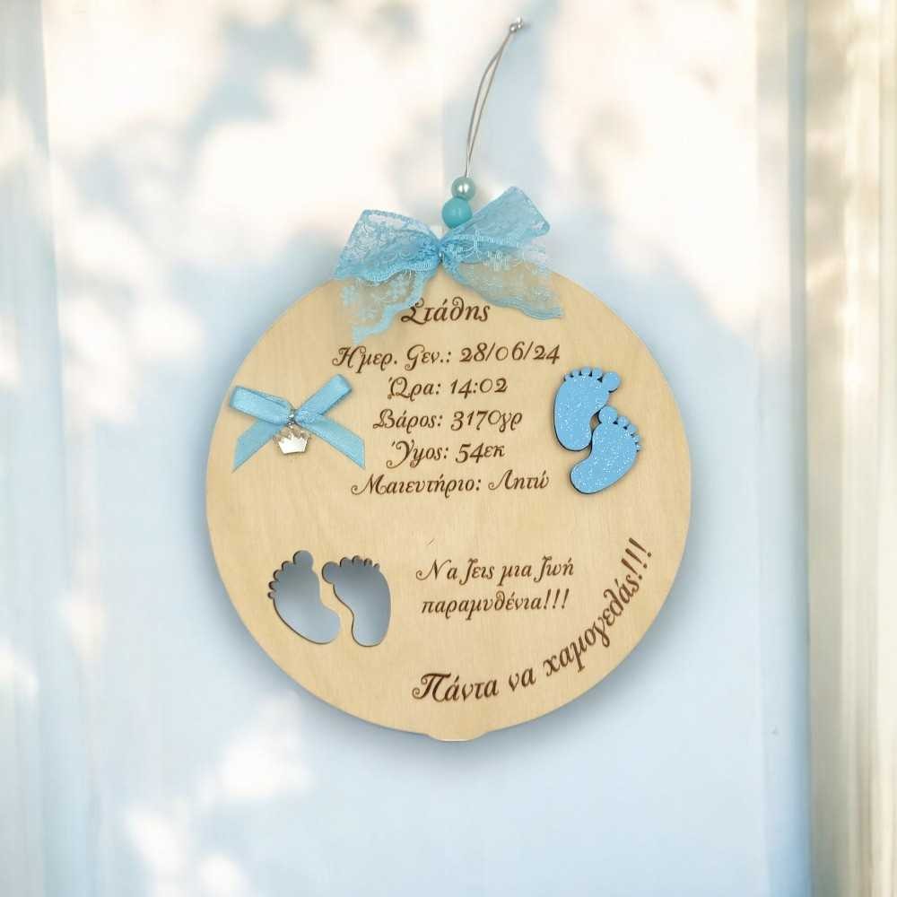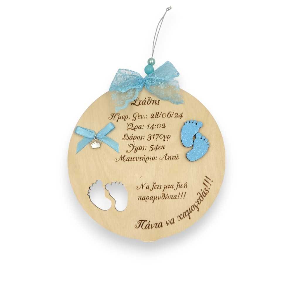 Ξύλινο χειροποίητο κρεμαστό διακοσμητικό χαραγμένο με τα στοιχεία γέννησης του μωρού και αφιέρωση.