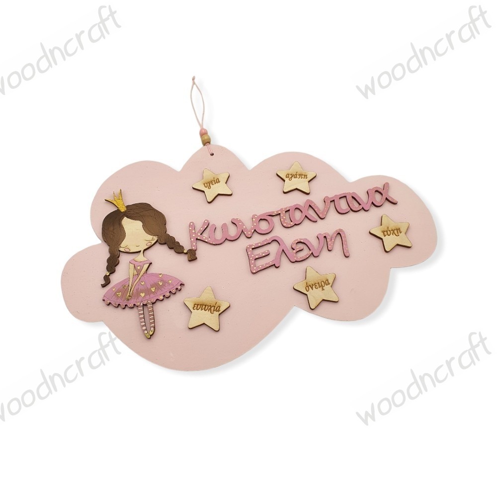 Ξύλινο χειροποίητο παιδικό ενθύμιο γέννησης σε σχέδιο σύννεφο με ένα γλυκό κοριτσάκι πριγκίπισσα! Βαμμένο και διακοσμημένο με το όνομα της επιλογής σας και ξύλινα αστεράκια χαραγμένα με ευχές ή τα στοιχεία γέννησης του παιδιού.