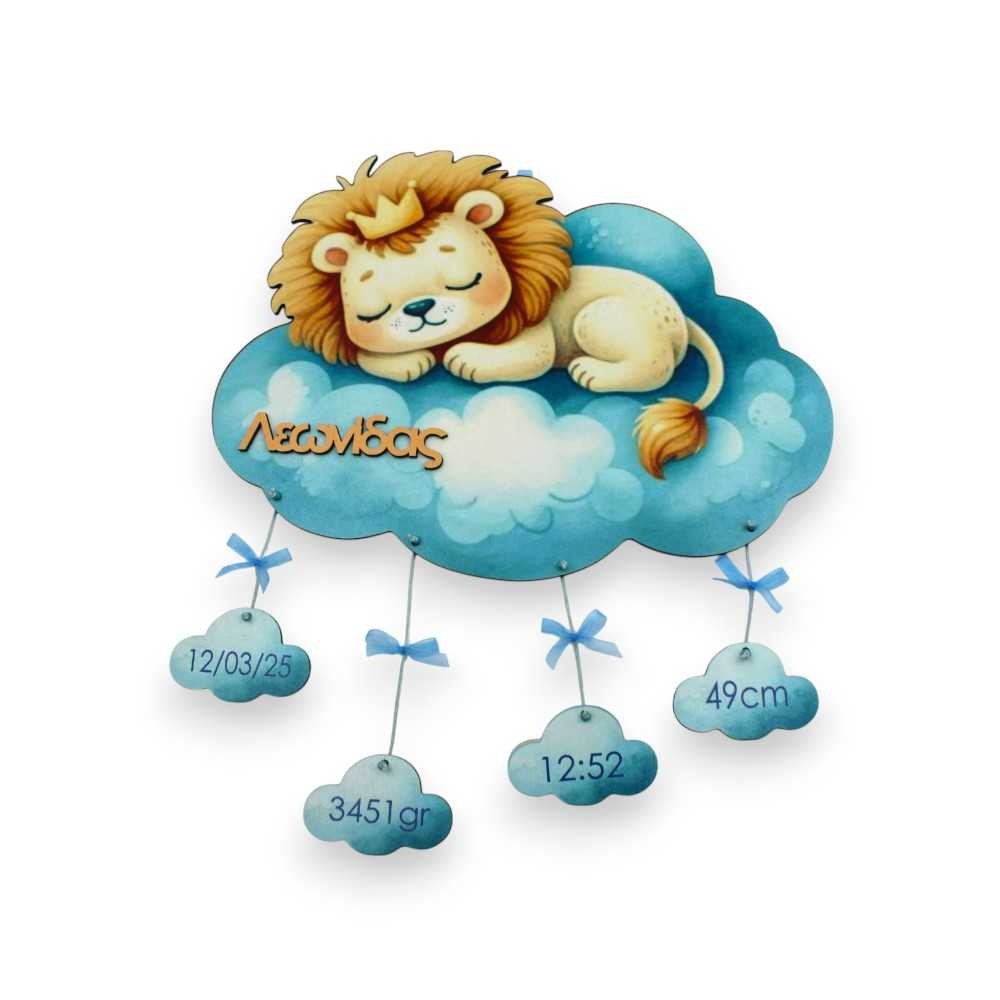 Στο πάνω μέρος, ένα γλυκό λιονταράκι με κορώνα κοιμάται πάνω σε ένα σύννεφο, συμβολίζοντας την τρυφερότητα και τη μοναδικότητα του μωρού σας.