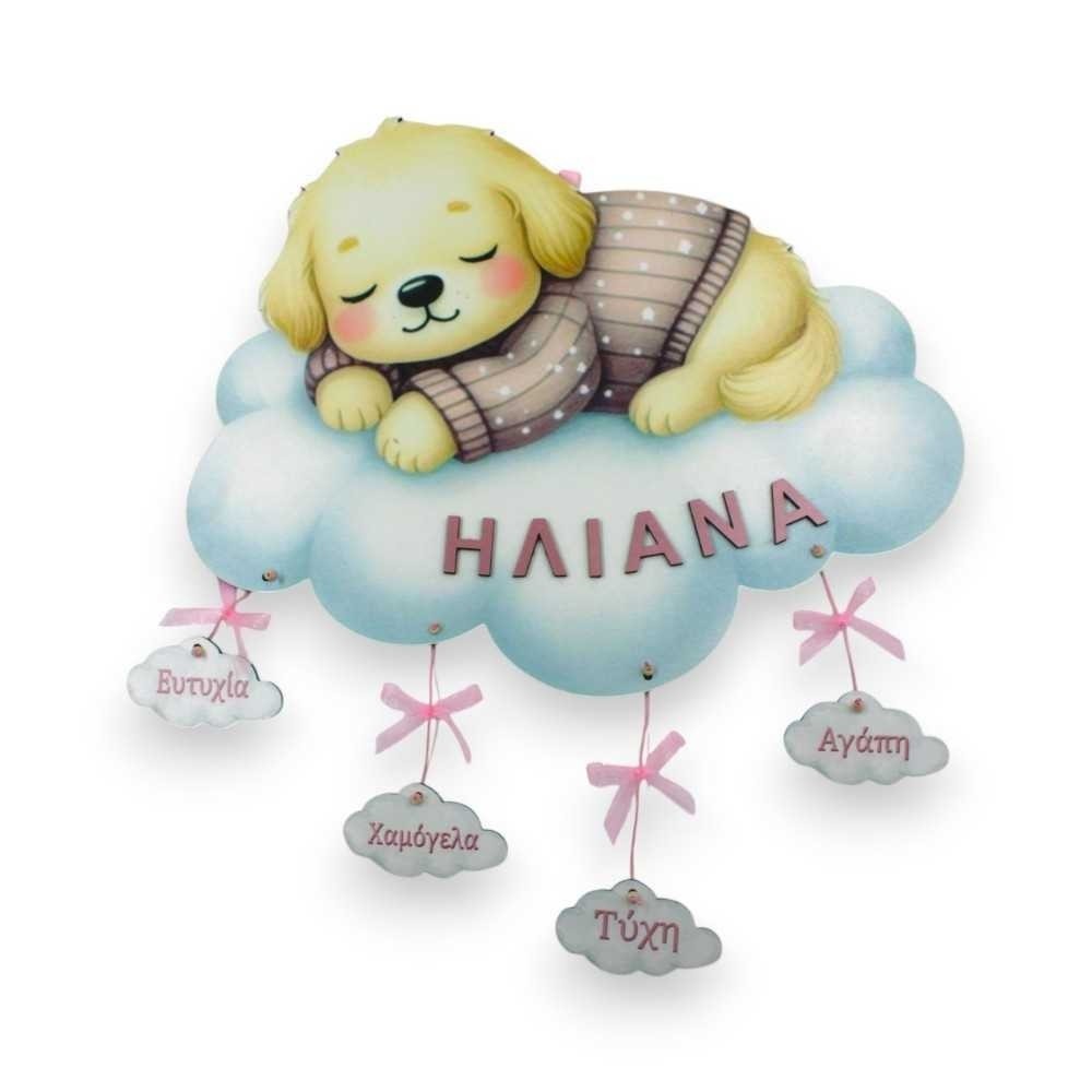 Στο πάνω μέρος, ένα γλυκό σκυλάκι κοιμάται πάνω σε ένα σύννεφο, συμβολίζοντας την τρυφερότητα και τη μοναδικότητα του μωρού σας.
