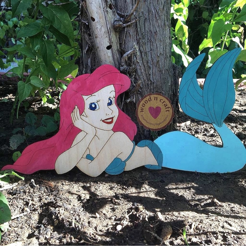 Ξύλινο σταντ στολισμού βάπτισης σε σχέδιο την αγαπημένη γοργόνα Άριελ. Η αγαπημένη μας πριγκίπισσα έρχεται για να διακοσμήσει το παιδικό δωμάτιο ενός κοριτσιού ή ακόμα και το πάρτι γενεθλίων.