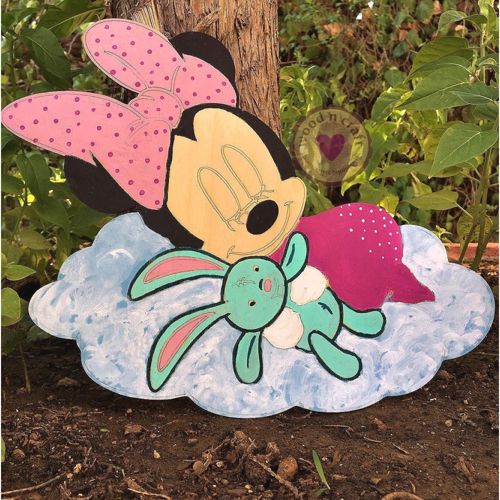 Ξύλινη φιγούρα στολισμού σε σχέδιο Μίνι μωρό να κοιμάται πάνω σε ένα συννεφάκι. Η αγαπημένη μας ηρωίδα από την σειρά Μίκυ Μάους έρχεται για να διακοσμήσει το παιδικό δωμάτιο, την βάφτιση που οργανώνετε ή ένα πάρτι γενεθλίων.