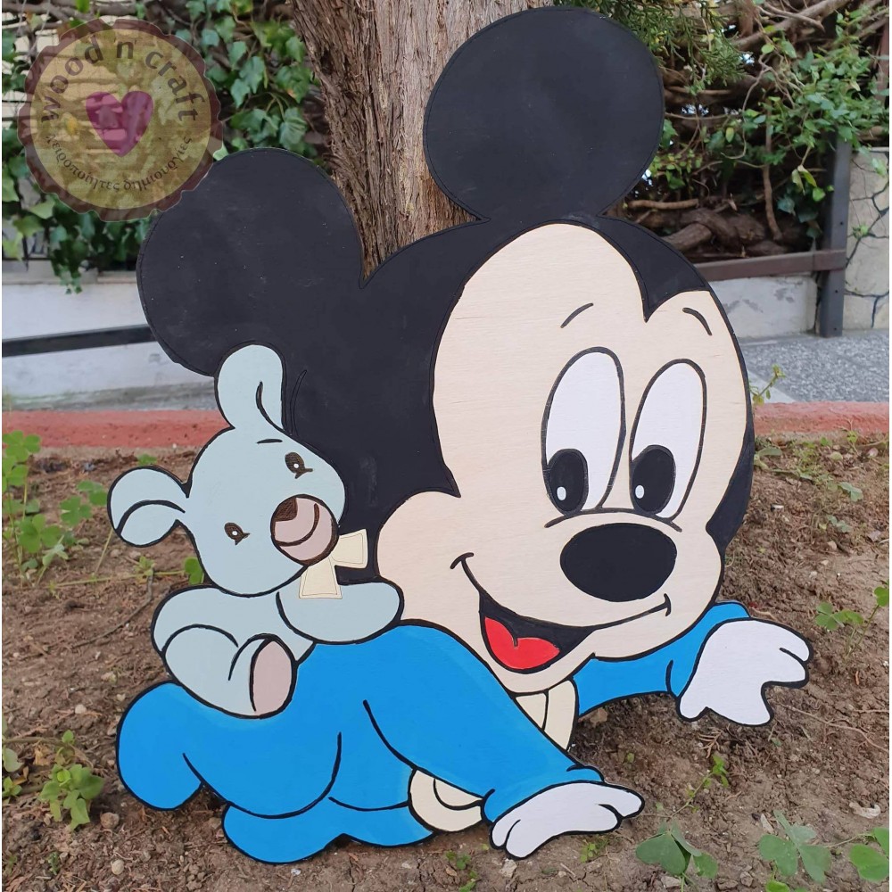Ξύλινο σταντ στολισμού βάπτισης σε σχέδιο Μίκυ Μάους μωράκι να μπουσουλάει μαζί με το αγαπημένο του αρκουδάκι! Ο αγαπημένος μας ήρωας από την παιδική σειρά έρχεται για να διακοσμήσει το παιδικό δωμάτιο ή ακόμα και το πάρτι γενεθλίων. Βάφεται σε χρώματα της επιλογής σας.