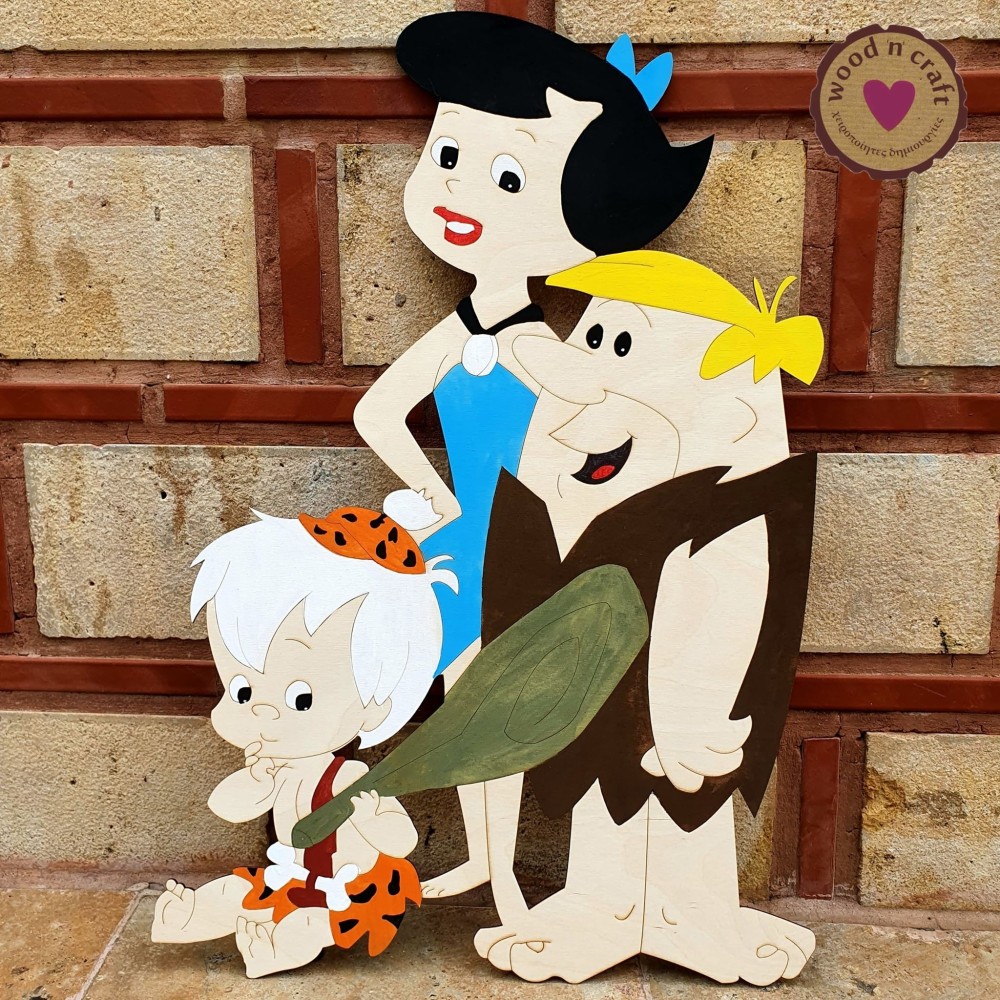 Ξύλινο σταντ στολισμού βάπτισης η οικογένεια του Μπαμ Μπαμ της αγαπημένης παιδικής σειράς Flinstones. Ένα πρωτότυπο σχέδιο κατάλληλο για τη διακόσμηση του παιδικού δωματίου και του πάρτι γενεθλίων!
