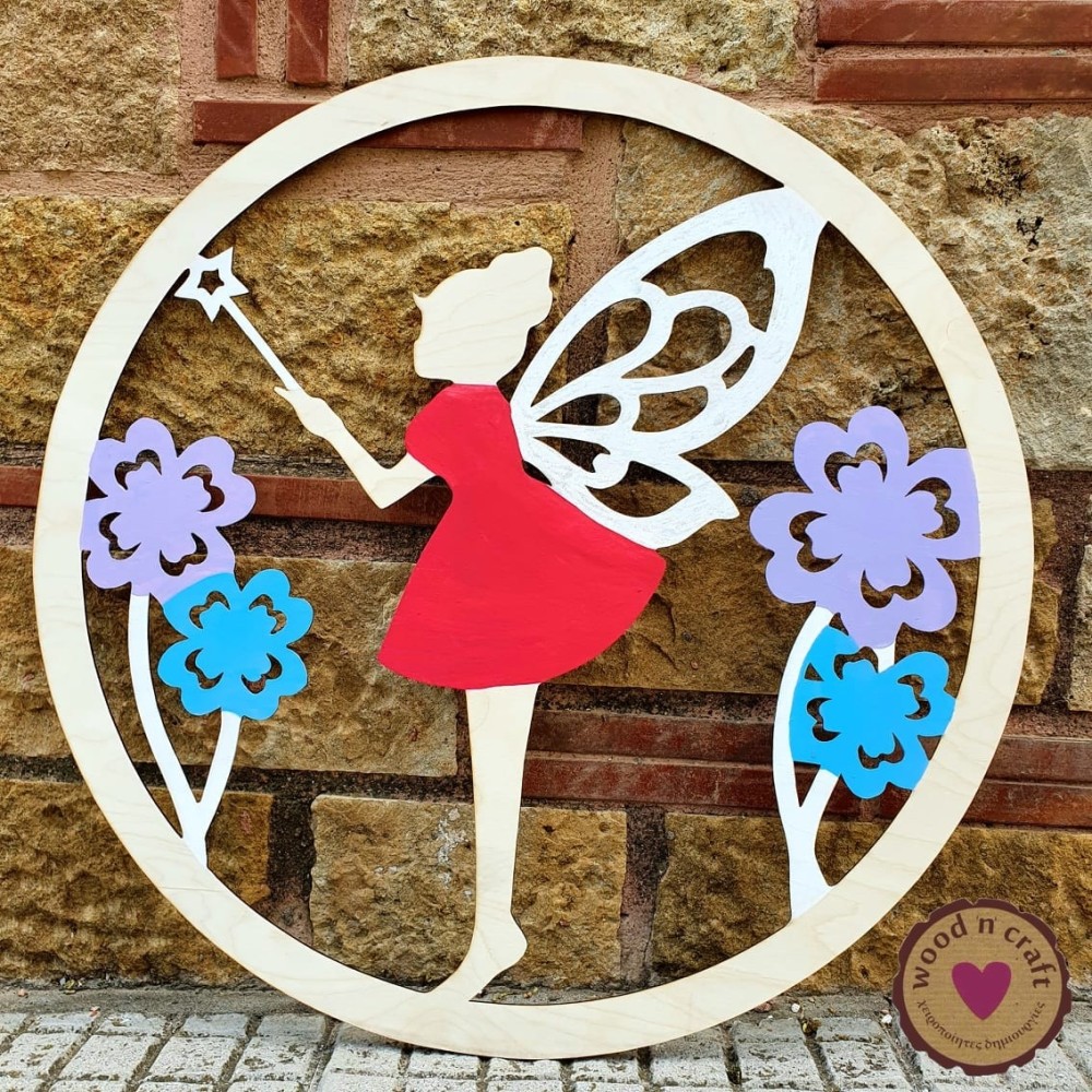 Ξύλινο σταντ στολισμού βάπτισης σε σχέδιο νεράιδα και λουλούδια προσαρμοσμένα μέσα σε στεφάνι. Ένα πρωτότυπο και μοναδικό σχέδιο κατάλληλο για τη διακόσμηση του παιδικού δωματίου και του πάρτι γενεθλίων! Διατίθεται σε επιτραπέζιο και σε κρεμαστό. Μέγεθος και χρώματα της επιλογής σας.