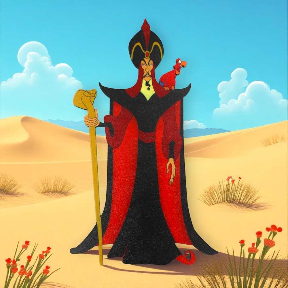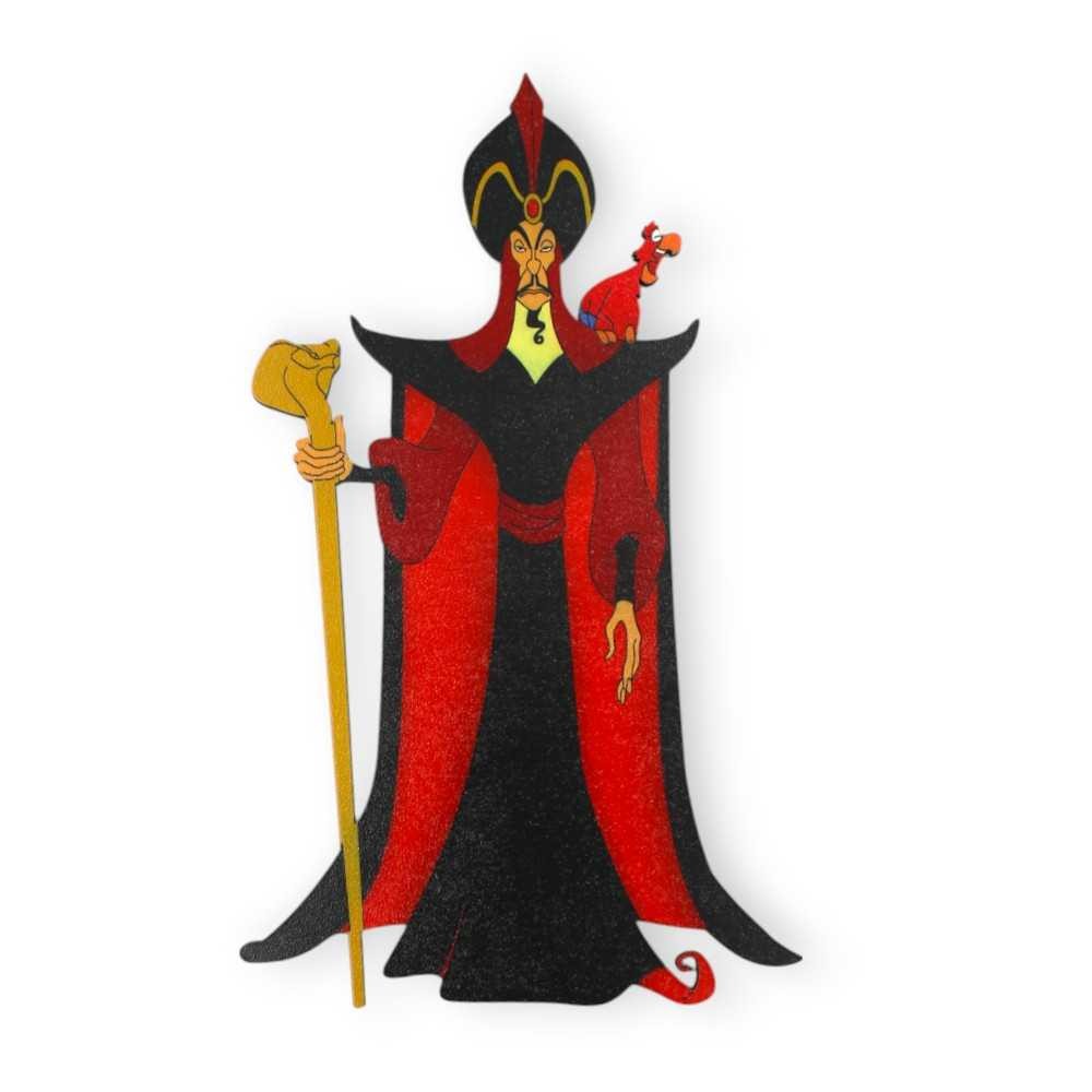 Ξύλινο σταντ στολισμού βάπτισης με τη φιγούρα του επιβλητικού μάγου Τζαφάρ με τον παπαγάλο Ιάγκο στον ώμο του, από το κλασικό παραμύθι του αγαπημένου ήρωα Αλαντίν! Ιδανική για να διακοσμήσει το παιδικό δωμάτιο και το πάρτι γενεθλίων.