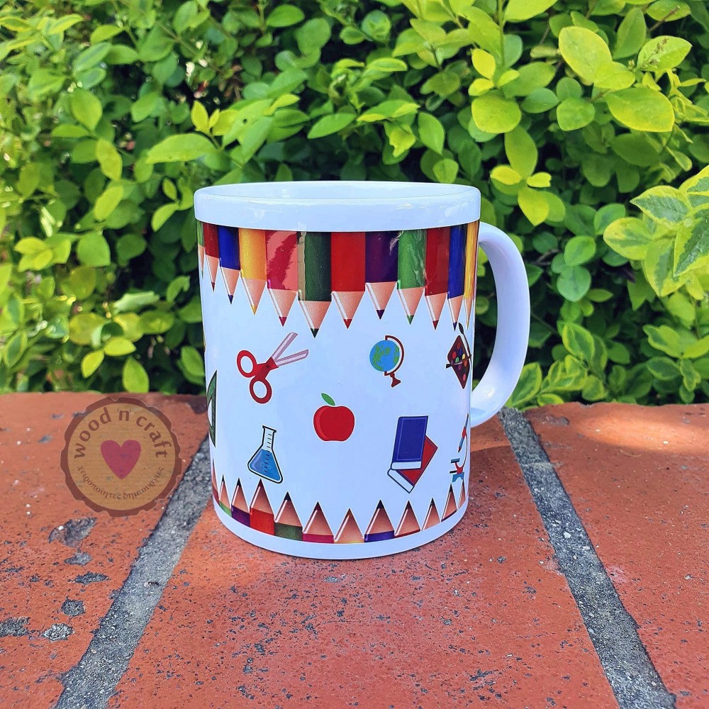 Μοναδική κούπα από λευκή πορσελάνη με τυπωμένη αφιέρωση για τον καλύτερο δάσκαλο και το όνομα της επιλογής σας πάνω σε ένα μαυροπίνακα πλαισιωμένο από πολύχρωμες ξυλομπογιές. Από την άλλη μεριά της κούπας υπάρχουν ένας χάρακας, ένα μήλο, ένα ψαλίδι κ.α. σχολικά σύμβολα!