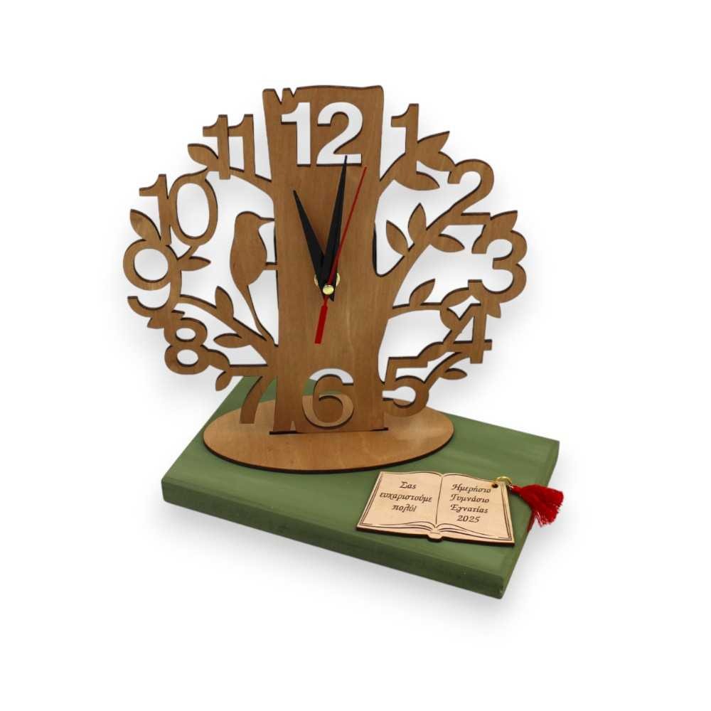 Ξύλινο χειροποίητο επιτραπέζιο ρολόι υψηλής αισθητικής σε σχέδιο δέντρο με προσαρμοσμένα έναν τρυποκάρυδο και τους αριθμούς του ρολογιού ανάμεσα στα κλαδιά! Στην βάση υπάρχει ένα βιβλιαράκι διακοσμημένο με φουντίτσα και χαραγμένη αφιέρωση για την δασκάλα ή τον δάσκαλο. Βάφεται στο χέρι σε χρώματα της επιλογής σας.