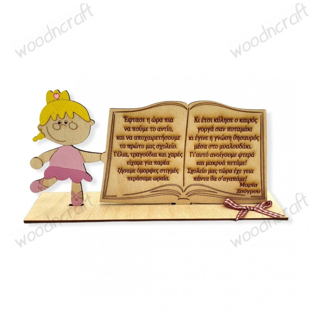 Ξύλινο χειροποίητο επιτραπέζιο σχολικό αναμνηστικό ή και δώρο για τους δασκάλους με ένα κοριτσάκι που κρατάει ένα βιβλίο με χαραγμένο αποχαιρετιστήριο κείμενο για το σχολείο!