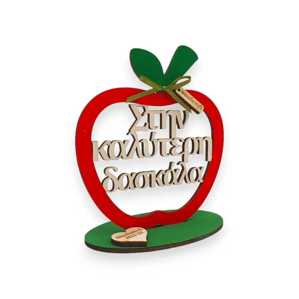 Το μήλο είναι βαμμένο και μπορεί να προσαρμοστεί με το όνομα του παιδιού και την σχολική χρονιά χαραγμένα σε μια ξύλινη καρδιά που διακοσμεί τη βάση του.