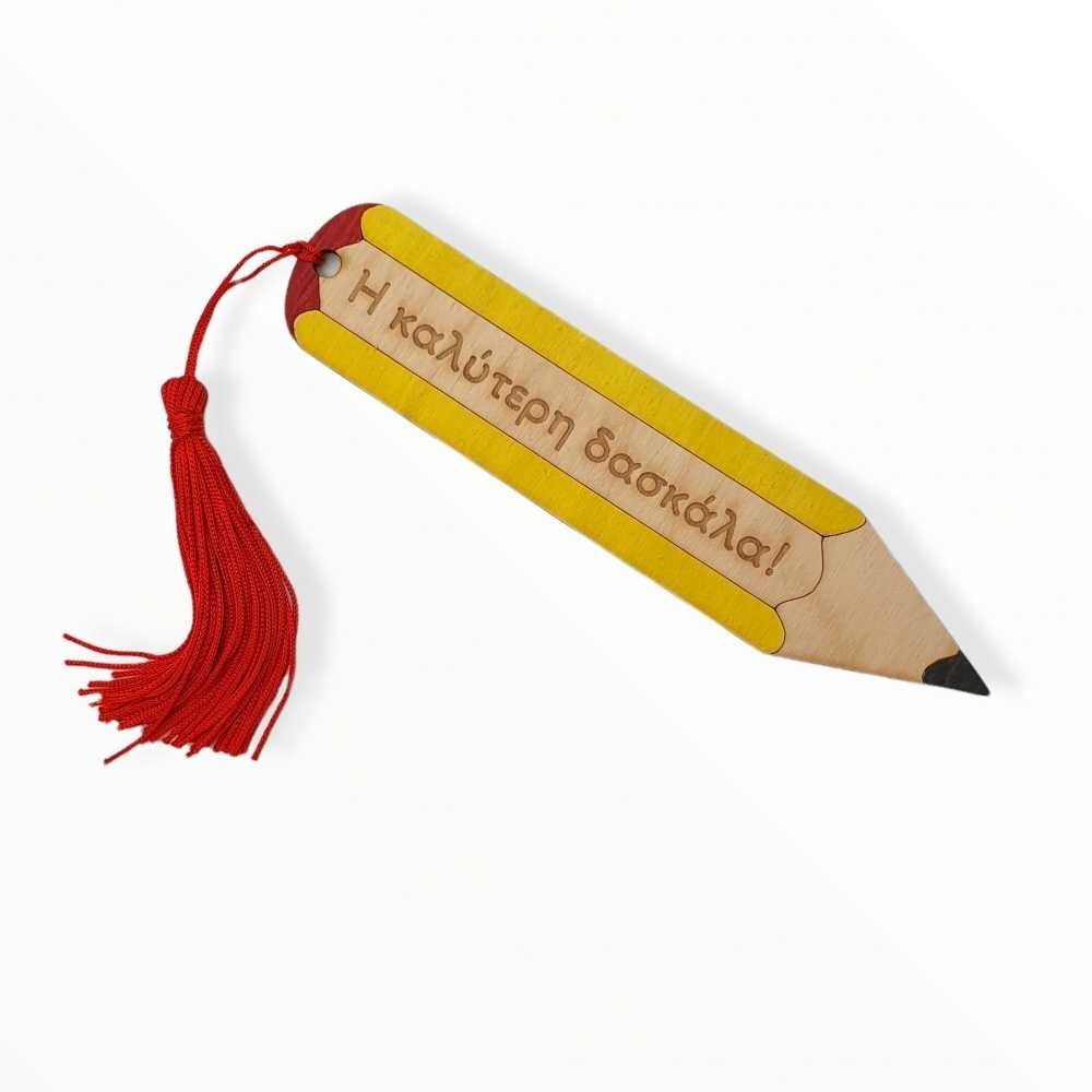 Ξύλινος σελιδοδείκτης σε σχήμα μολυβιού, βαμμένος και χαραγμένος με αφιέρωση στην καλύτερη δασκάλα ή στον καλύτερο δάσκαλο και διακοσμημένος με κρεμαστή κόκκινη φούντα!