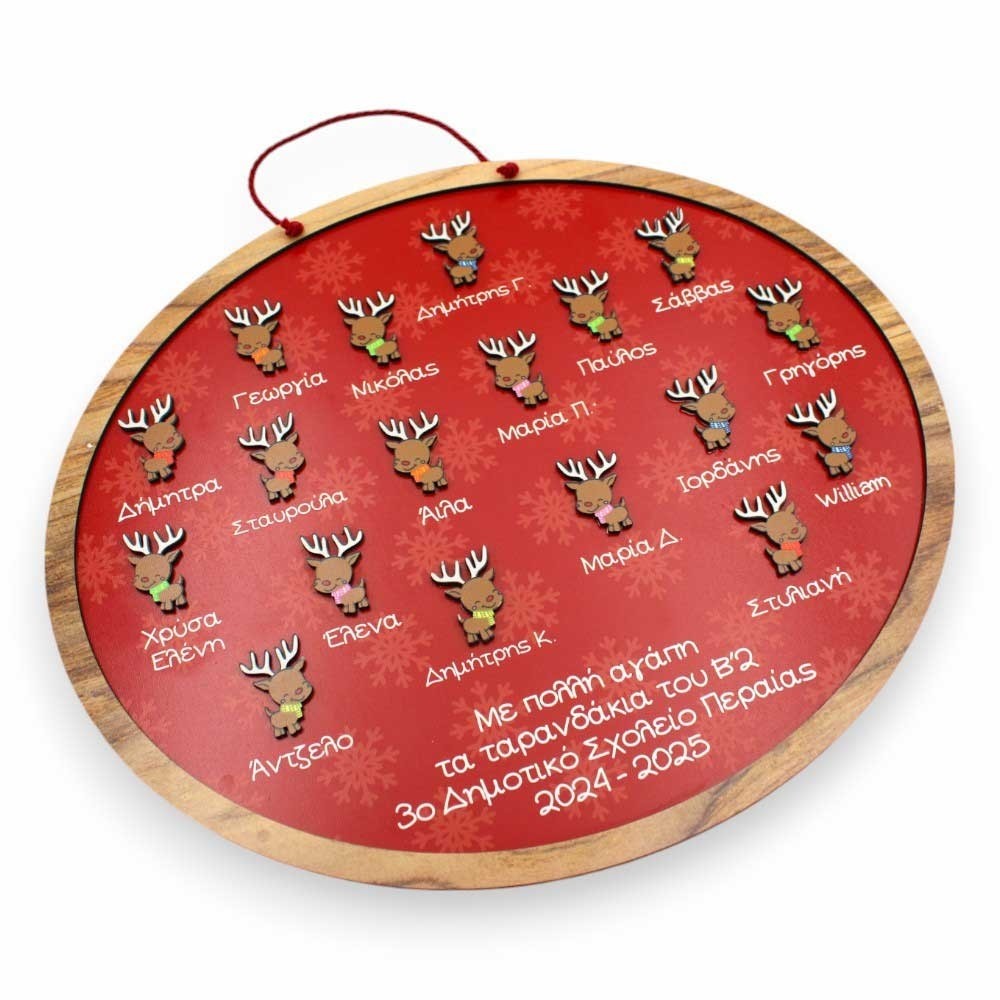 Κατασκευασμένο από δύο επίπεδα ξύλου, διακοσμημένο με εκτύπωση UV υψηλής ποιότητας, περιλαμβάνει μικρά ξύλινα ταρανδάκια με τα ονόματα των μαθητών και μια ιδιαίτερη αφιέρωση για την αγαπημένη δασκάλα.
