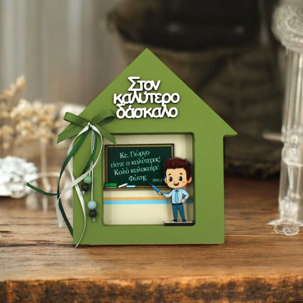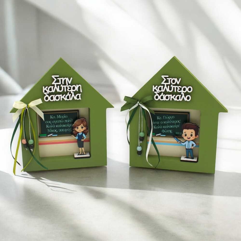 Στο πάνω μέρος του σπιτιού, υπάρχει ξύλινη αφιέρωση "Στον καλύτερο δάσκαλο" ή "Στην καλύτερη δασκάλα", ενώ στο εσωτερικό της σύνθεσης υπάρχει μαυροπίνακας με προσωπικό μήνυμα και το όνομα του παιδιού.