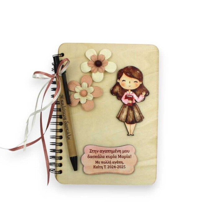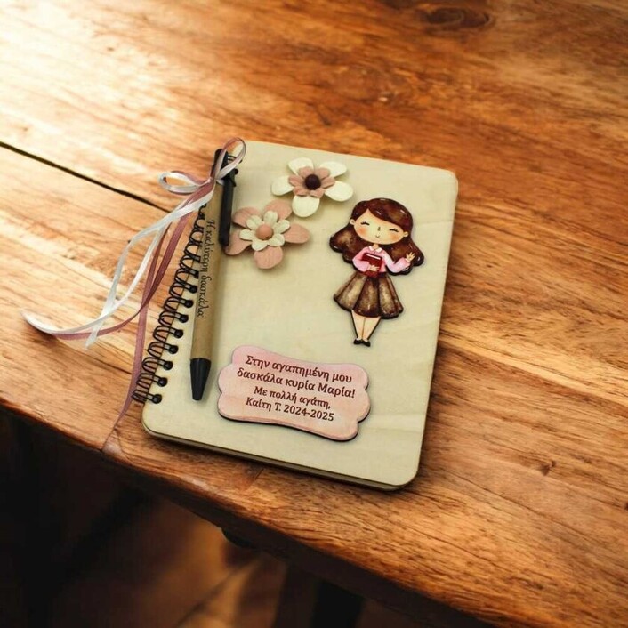 Το εξώφυλλο κοσμείται από μια ξύλινη φιγούρα δασκάλας με UV εκτύπωση και ένα ξύλινο ταμπελάκι που φέρει προσωποποιημένη αφιέρωση — ένα μήνυμα που σίγουρα θα κρατήσει χαραγμένο στην καρδιά της για πάντα.