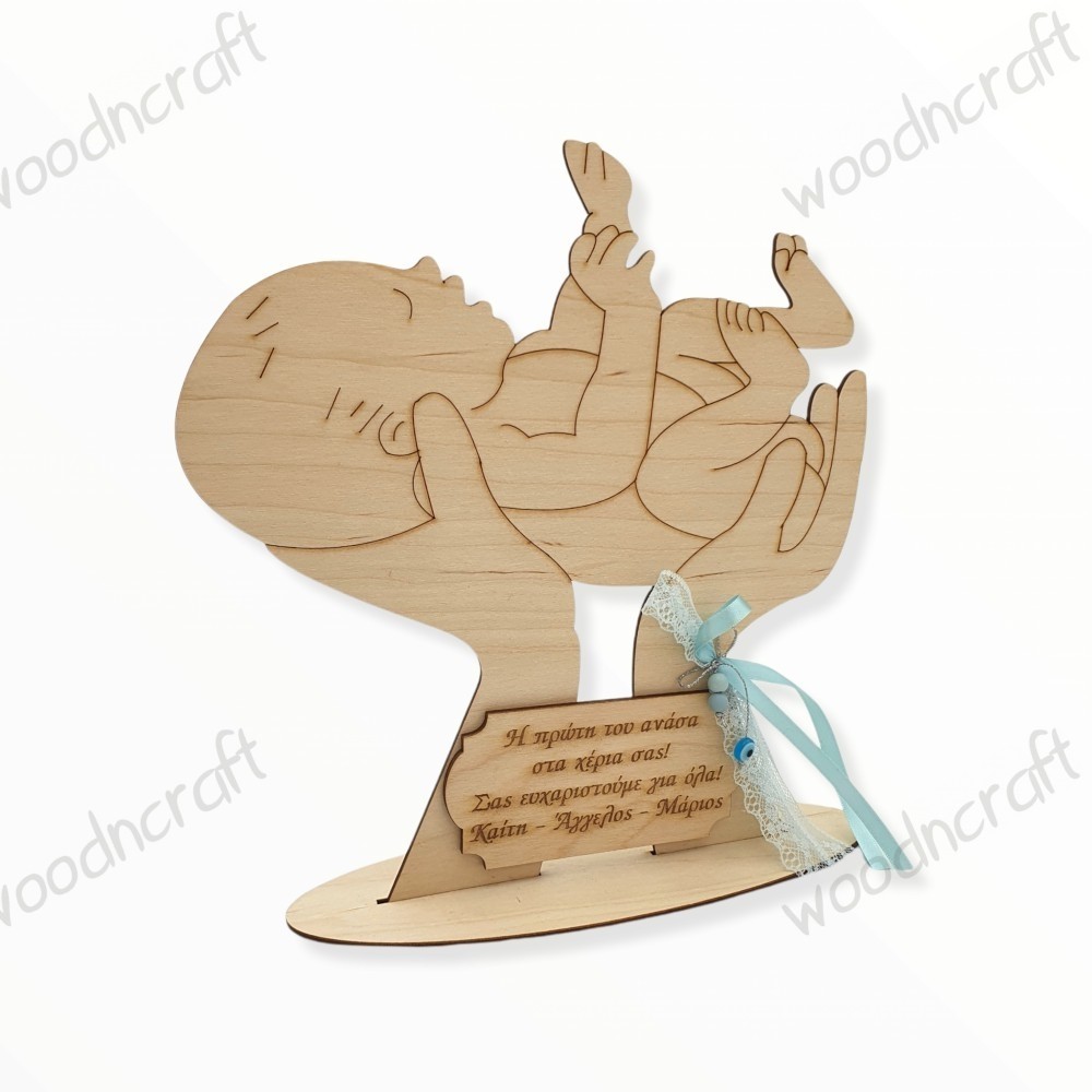 Μοναδικό ξύλινο επιτραπέζιο διακοσμητικό με δυο χέρια που κρατάνε ένα νεογέννητο μωράκι, ταμπελάκι χαραγμένο με την αφιέρωση της επιλογής σας και διακοσμημένο με δαντέλα, κορδελάκι, χάντρες και ματάκι!