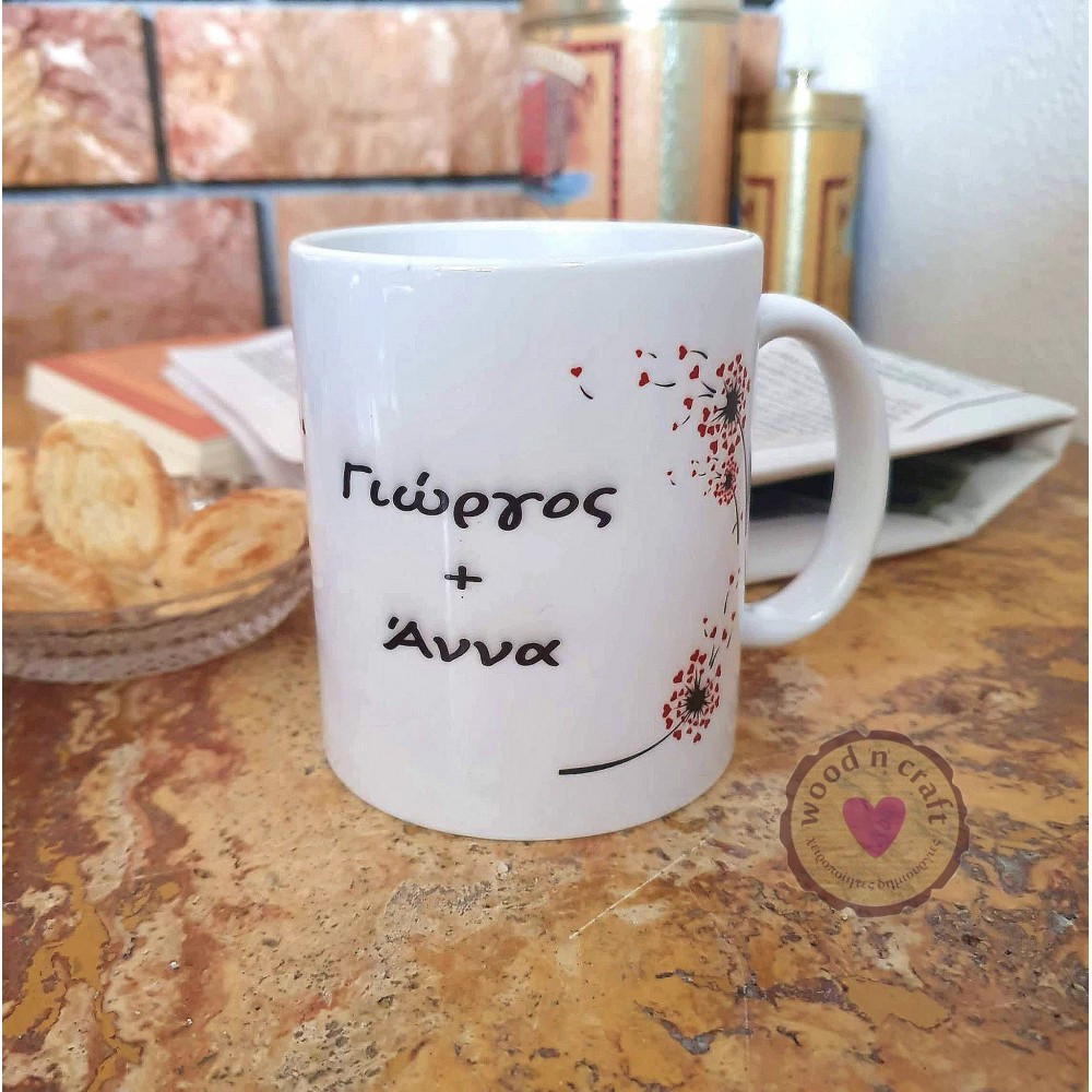Πρωτότυπη κούπα από λευκή πορσελάνη με απεικόνιση ένα δέντρο με πολλές πολλές καρδούλες, από κάτω ένα ερωτευμένο ζευγαράκι.. και δίπλα τα ονόματα της επιλογής σας αγκαλιασμένα από δύο λουλουδάκια με καρδιές!