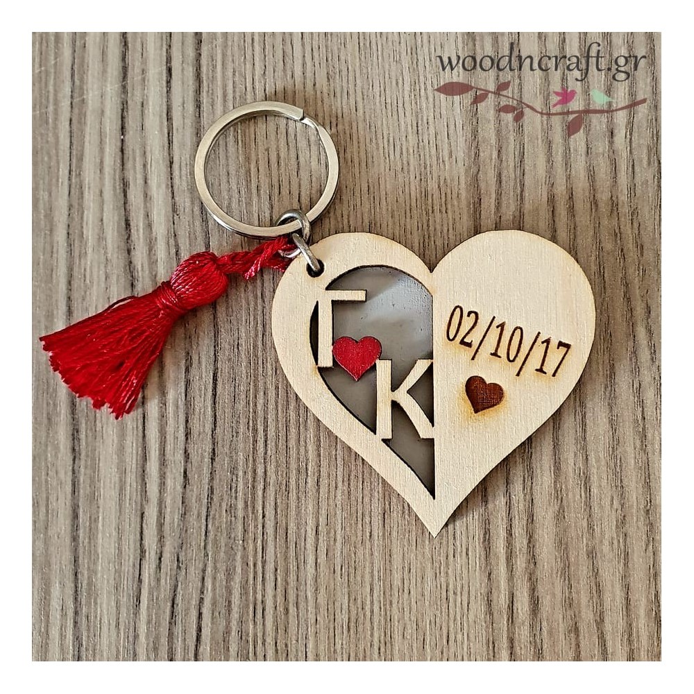 Ξύλινο χειροποίητο 3D μπρελόκ καρδιά με προσαρμοσμένα τα μονογράμματα της επιλογής σας και χαραγμένη την ημερομηνία σας! Βαμμένο στο χέρι και διακοσμημένο με κόκκινη φουντίτσα.