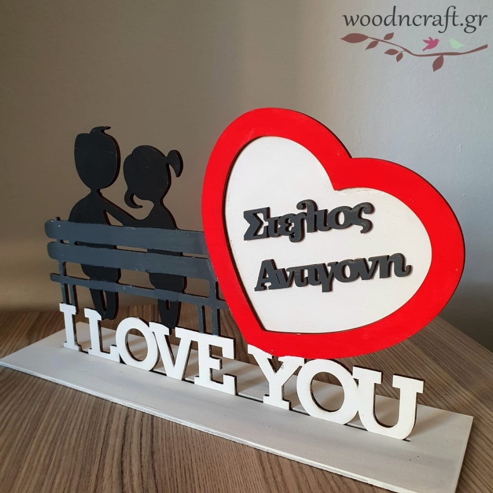 Ξύλινο χειροποίητο σταντ i love you με προσαρμοσμένη καρδιά και ένα ρομαντικό ζευγάρι σε παγκάκι. Βαμμένο σε χρώματα της επιλογής σας και προσωποποιημένο με τα ονόματα σας!