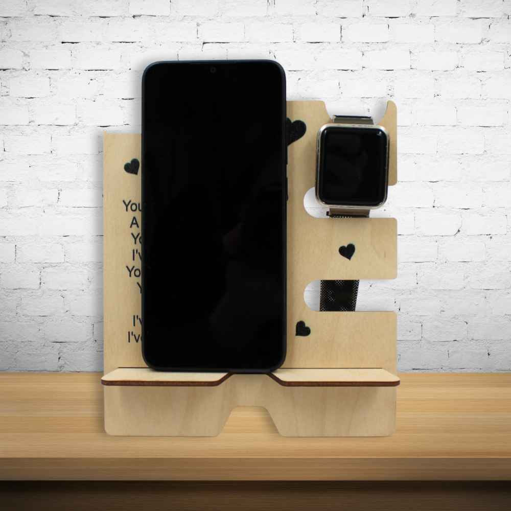 Πρωτότυπο ξύλινο σταντ γραφείου με αφιέρωση της επιλογής σας, κατάλληλο για την οργάνωση των προσωπικών σας αντικειμένων και με θέση που επιτρέπει την φόρτιση του κινητού.