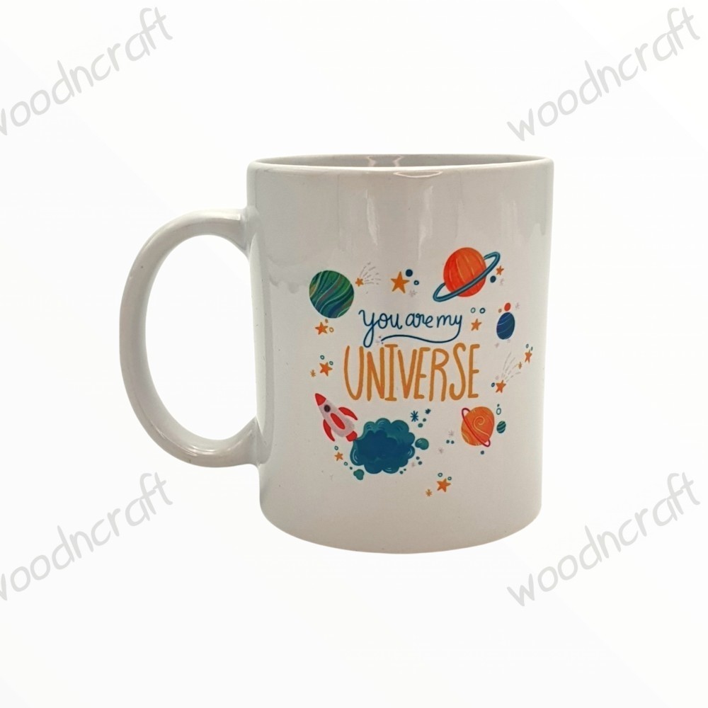 Πρωτότυπη κούπα από λευκή πορσελάνη με τυπωμένη αφιέρωση "You are my universe" μέσα σε διάσπαρτα στοιχεία από το διάστημα από την μία πλευρά... και από την άλλη πλευρά η αφιέρωση της επιλογής σας!