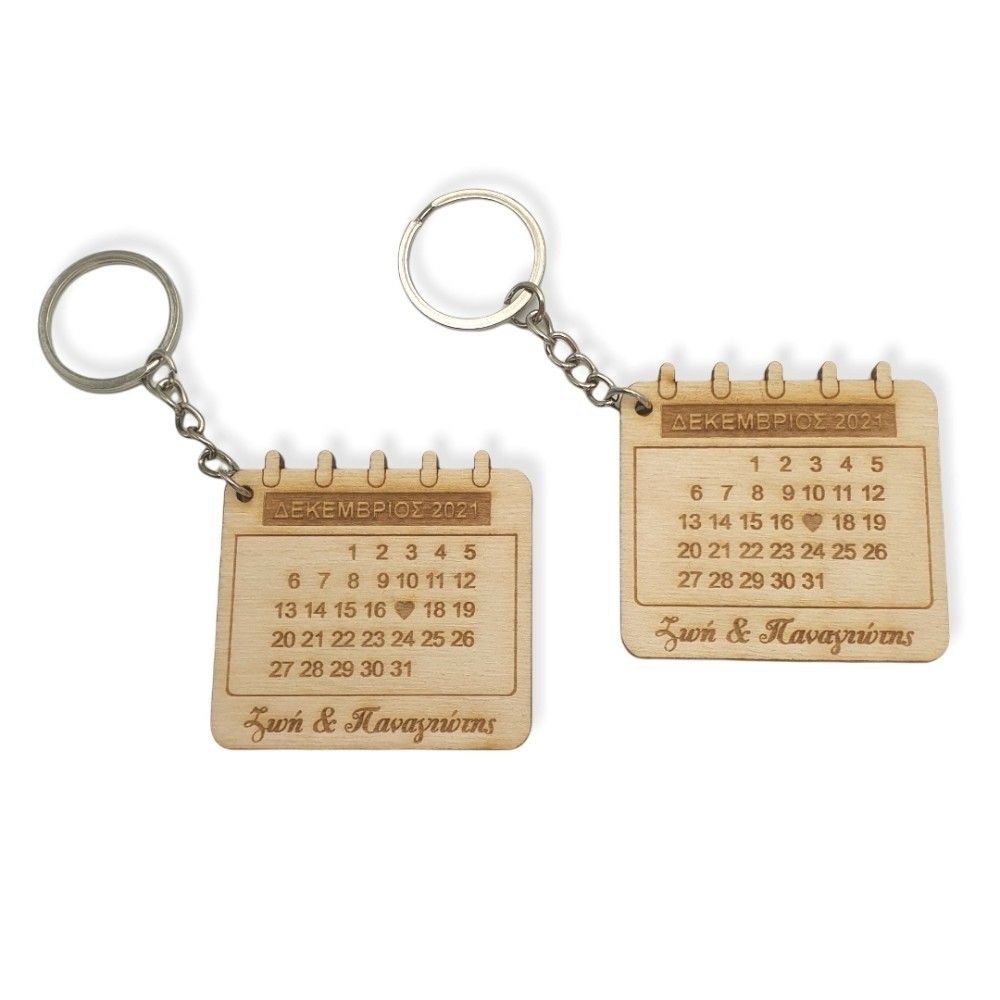 Σετ ξύλινα, προσωποποιημένα μπρελόκ σε σχέδιο ημερολόγιο στα οποία έχει επισημανθεί η ημέρα, ο μήνας και η χρονολογία της επιλογής σας, καθώς και τα ονόματά σας! Φτιαγμένα με μεταλλικό κρίκο και αλυσίδα σε ασημί χρώμα.