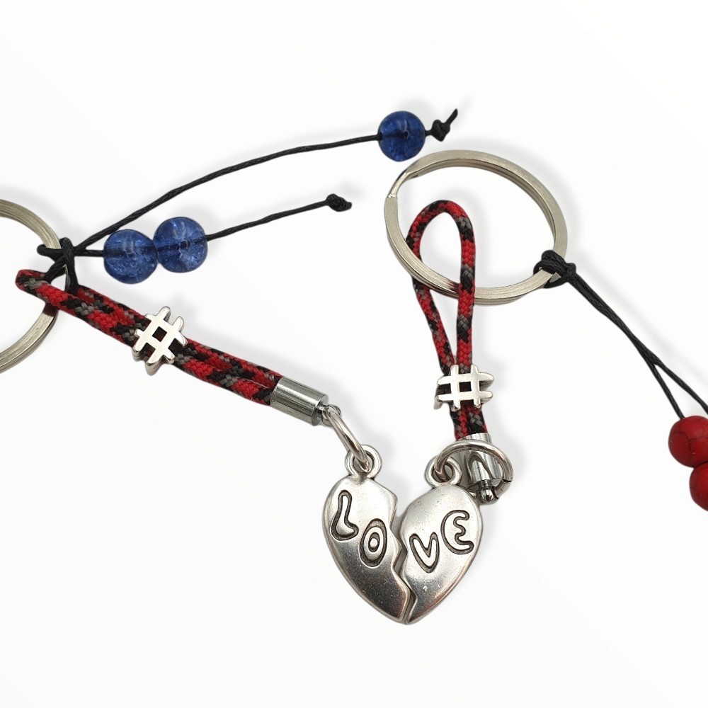 Πρωτότυπο σετάκι από χειροποίητα μπρελόκ με μεταλλική καρδιά love στην μέση! Φτιαγμένα με μεταλλικούς κρίκους σε ασημί χρώμα, ορειβατικό κορδόνι, μεταλλικά στοιχεία hashtag και χάντρες!
