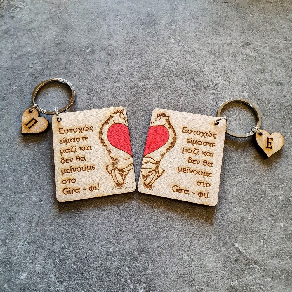 Μοναδικό και ξεχωριστό παιχνιδιάρικο σετάκι από ξύλινα μπρελόκ με καμηλοπαρδάλεις που φιλιούνται. Ανάμεσά τους βρίσκεται μια καρδιά και είναι χαραγμένη η αφιέρωση με το λογοπαίγνιο του ''ονόματός'' τους. Είναι φτιαγμένα μe μεταλλικά κρικάκια ασημί χρώματος και διακοσμημένα με ξύλινες καρδούλες χαραγμένες με τα αρχικά της επιλογής σας.