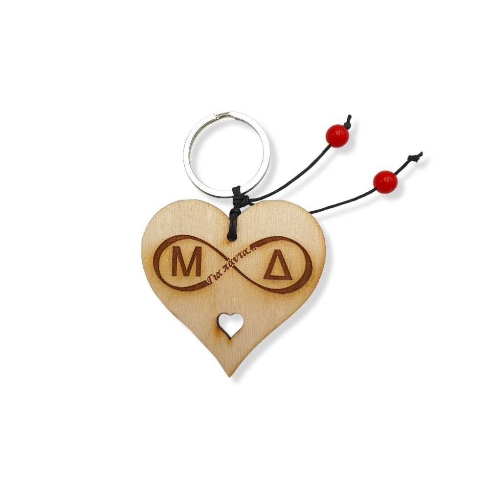 Ξύλινο χειροποίητο μπρελόκ καρδιά με χαραγμένο το άπειρο και τα αρχικά των ονομάτων σας! Φτιαγμένο με ασημί μεταλλικό κρίκο, σκοινάκι και κόκκινες χάντρες!