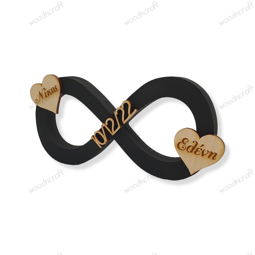 Ξύλινο χειροποίητο αυτοστηριζόμενο διακοσμητικό υψηλής αισθητικής που απεικονίζει το 'Άπειρο'', με τα ονόματά σας χαραγμένα σε ξύλινες καρδούλες και με κολλημένη στο κέντρο την ημερομηνία. Λουστραρισμένο και βαμμένο στο χέρι στα χρώματα της επιλογής σας!