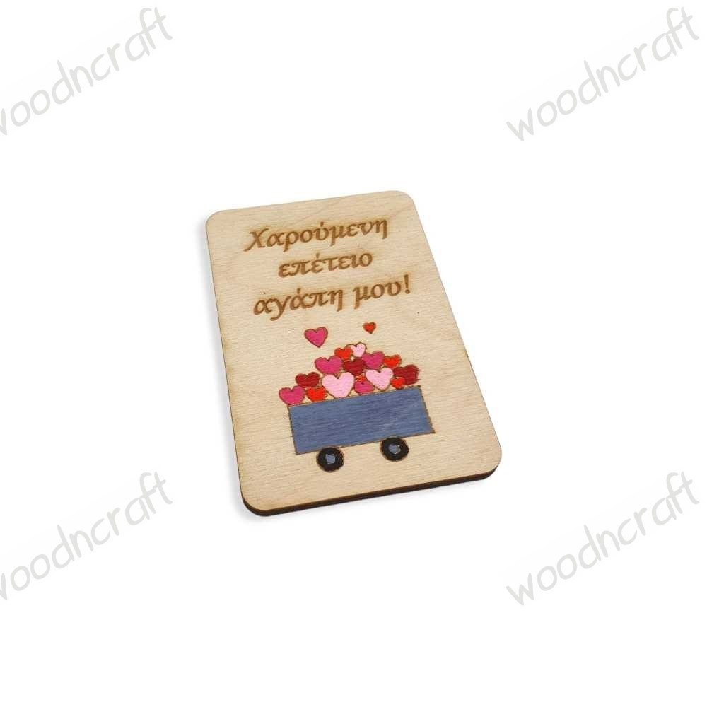 Προσωποποιημένο ξύλινο μαγνητάκι με σχέδιο ένα βαγόνι γεμάτο καρδιές και χάραξη της δικής σας αφιέρωσης!