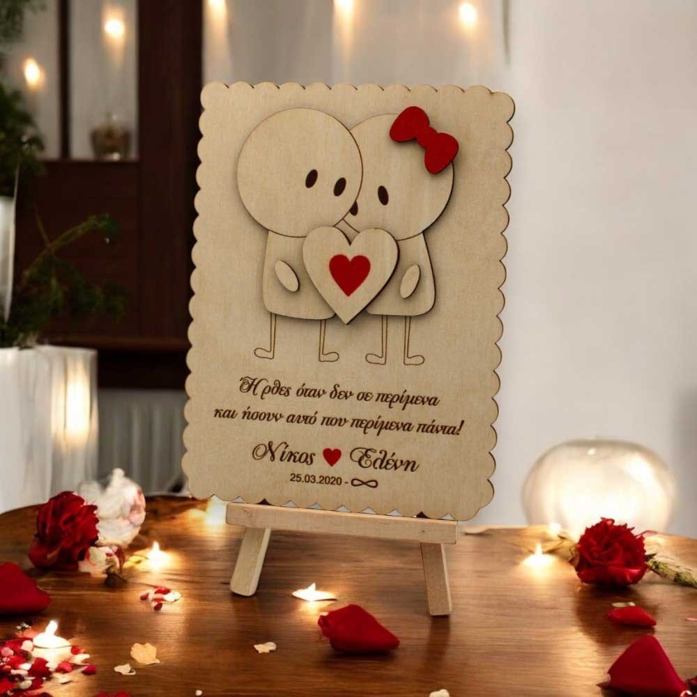 Το ξύλινο διακοσμητικό τοποθετείται σε ένα κομψό ξύλινο καβαλέτο, ιδανικό για να στολίσει οποιοδήποτε χώρο με ένα ζεστό, προσωπικό άγγιγμα. Ένα τέλειο δώρο επετείου, σχέσης γάμου ή αρραβώνα που θα μείνει αξέχαστο! 🎁✨