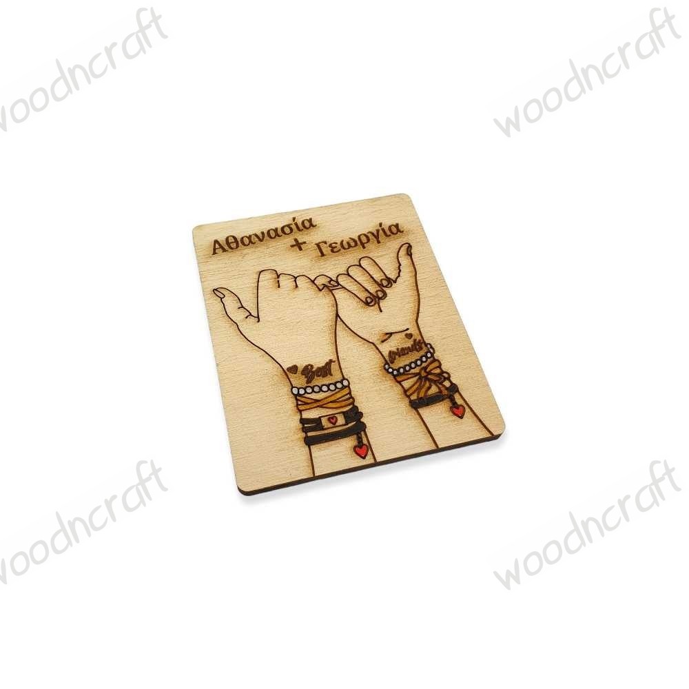 Προσωποποιημένο ξύλινο μαγνητάκι με χαραγμένο σχέδιο δύο χέρια που δίνουν μια υπόσχεση και φυσικά τα ονόματα της επιλογής σας!