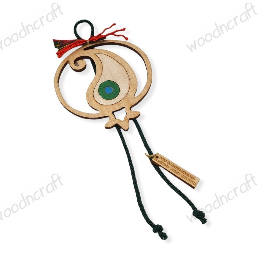 Πρωτότυπο ξύλινο χειροποίητο γούρι σε σχέδιο διάτρητο ρόδι με προσαρμοσμένο ένα μάτι - δάκρυ στο κέντρο του! Βαμμένο στο χέρι και διακοσμημένο με κορδόνι, κορδελάκια και κρεμαστό ταμπελάκι χαραγμένο με τα στοιχεία σας!
