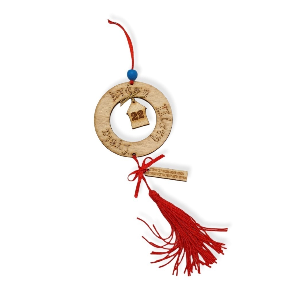 Πρωτότυπο χειροποίητο γούρι με ξύλινο κρίκο χαραγμένο περιμετρικά με ευχές και στο κέντρο του κρεμαστό σπιτάκι χαραγμένο με το νέο έτος! Διακοσμημένο με χάντρα, φιογκάκι, κόκκινη κρεμαστή φούντα και ταμπελάκι με την προσωπική σας χάραξη.
