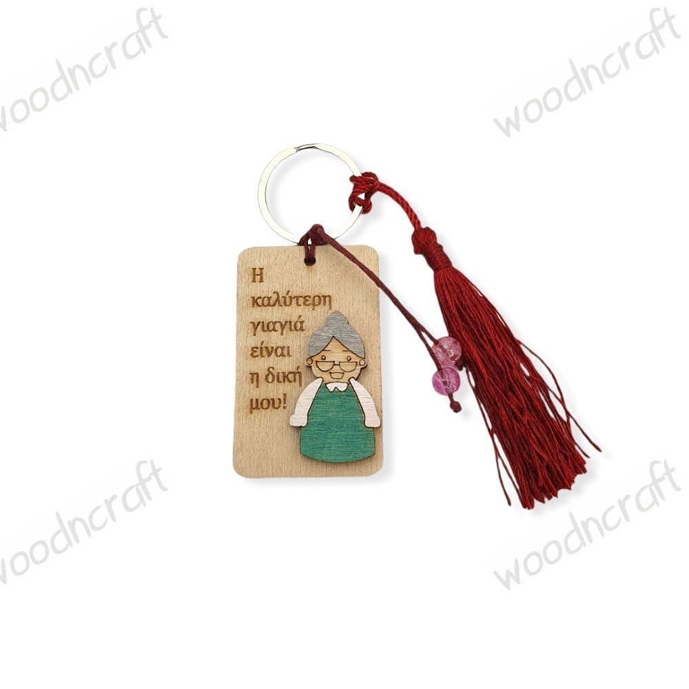 Ξύλινο χειροποίητο μπρελόκ με μία γιαγιά και αφιέρωση: Η καλύτερη γιαγιά είναι η δική μου! Βαμμένο και διακοσμημένο με φούντα και περλίτσες!