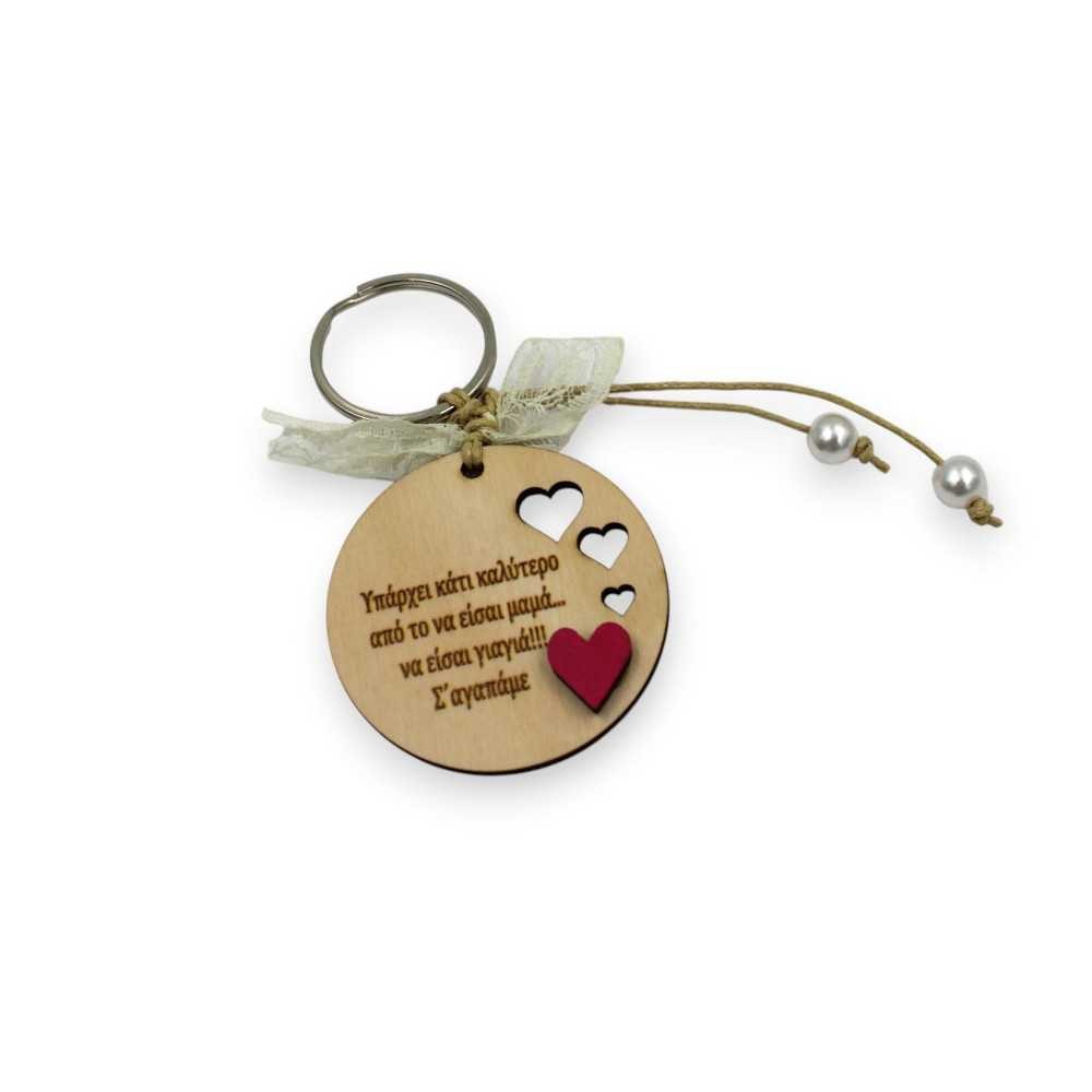 Μοναδικό ξύλινο χειροποίητο μπρελόκ με καρδούλες και αφιέρωση για τη γιαγιά! Διακοσμημένο με φιογκάκι και πέρλες.